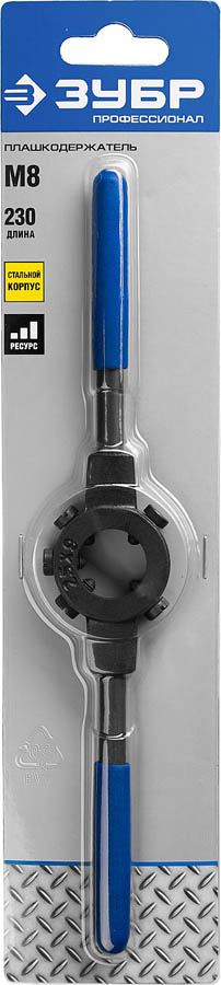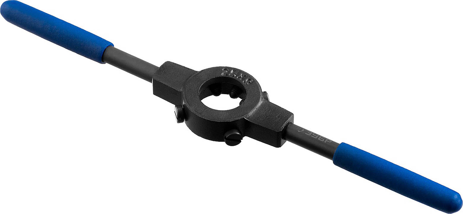 Плашкодержатель ЗУБР 28150-25, применяется при ручном нарезании внешней резьбы совместно с плашками. Специальные резиновые накладки на ручки предотвращают проскальзывание и обеспечивают надежность хвата. Плашкодержатель оснащен стопорными центровочными винтами для надежной фиксации плашки, парооксидирование защищает поверхность от коррозии.