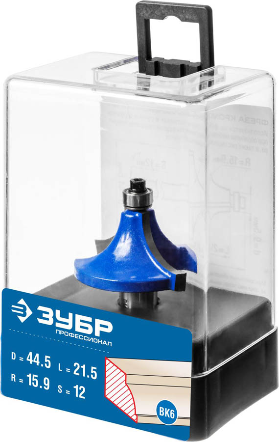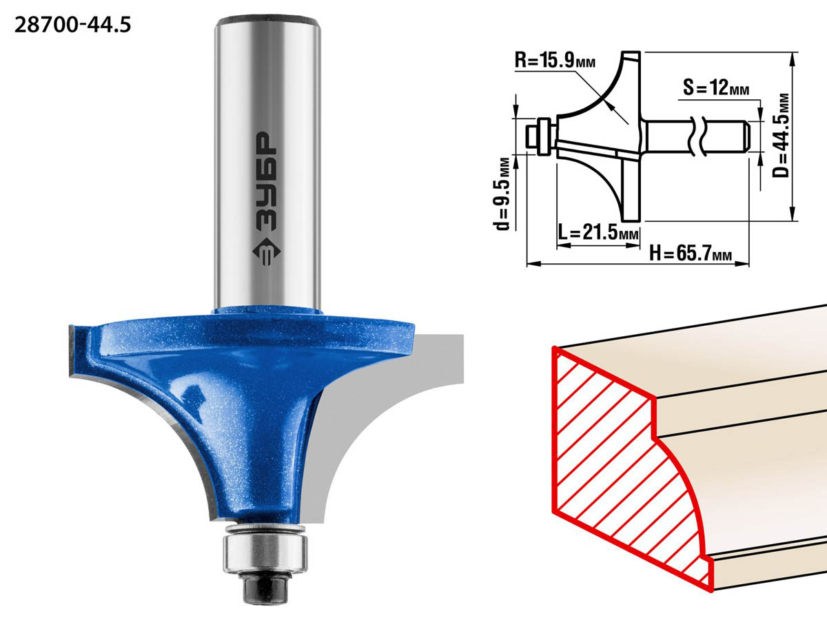 Фреза кромочная калевочная №1, D= 44,5мм, рабочая длина-21,5мм, радиус-15,9мм, хв.-12мм, d-9,5мм, ЗУБР Профессионал