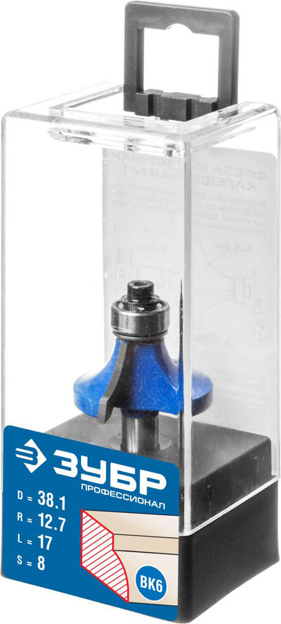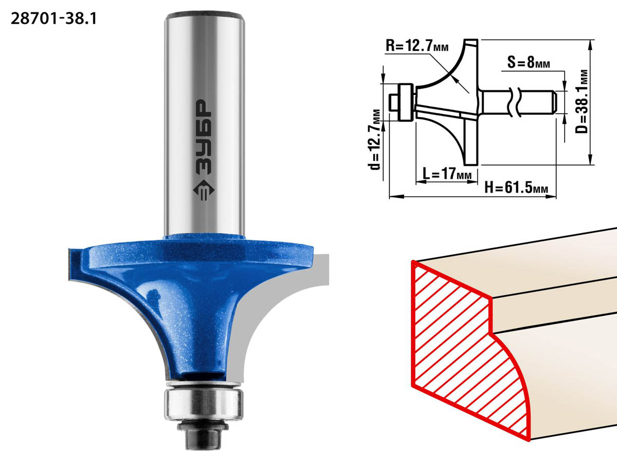 Фреза кромочная калевочная №1, D= 38,1мм, рабочая длина-17мм, радиус-12,7мм, хв.-8мм, d-12,7мм, ЗУБР Профессионал