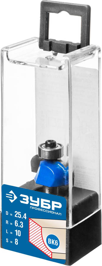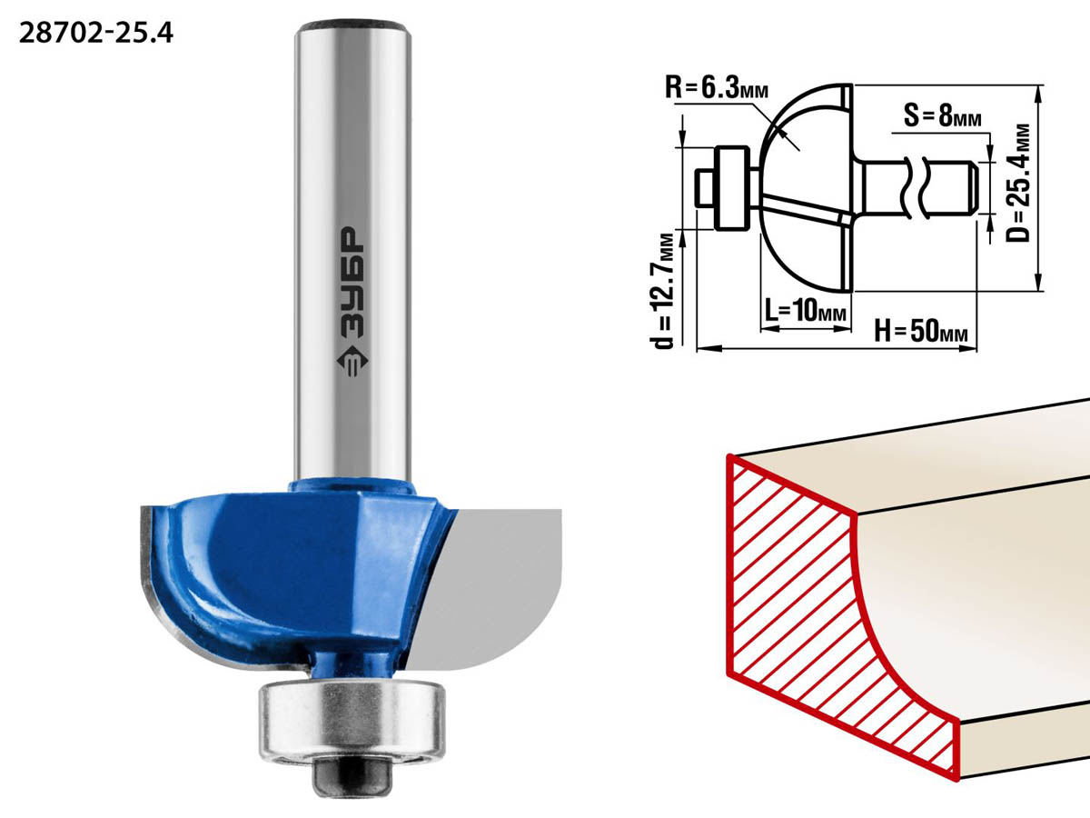 Фреза кромочная калевочная №2, D= 25,4мм, рабочая длина-10мм, радиус-6,3мм, хв.-8мм, d-12,7мм, ЗУБР Профессионал