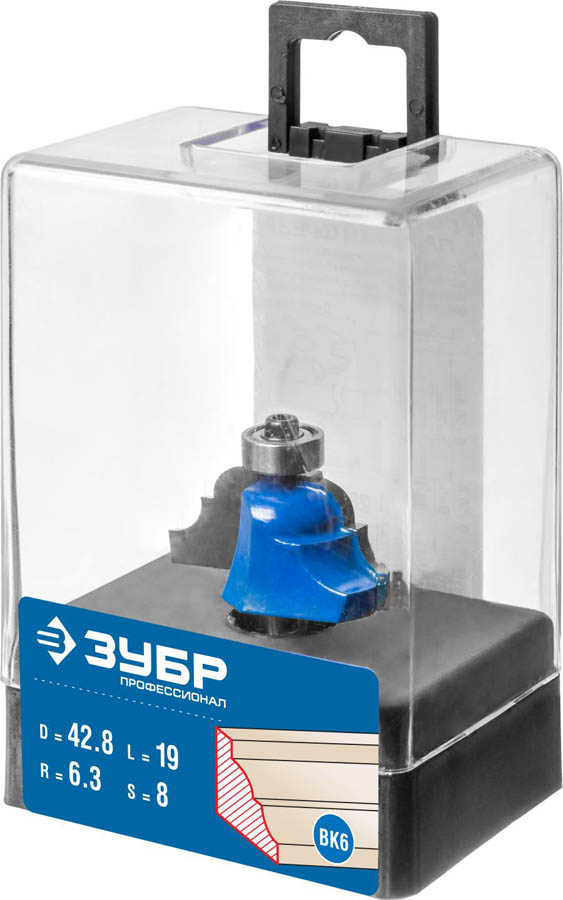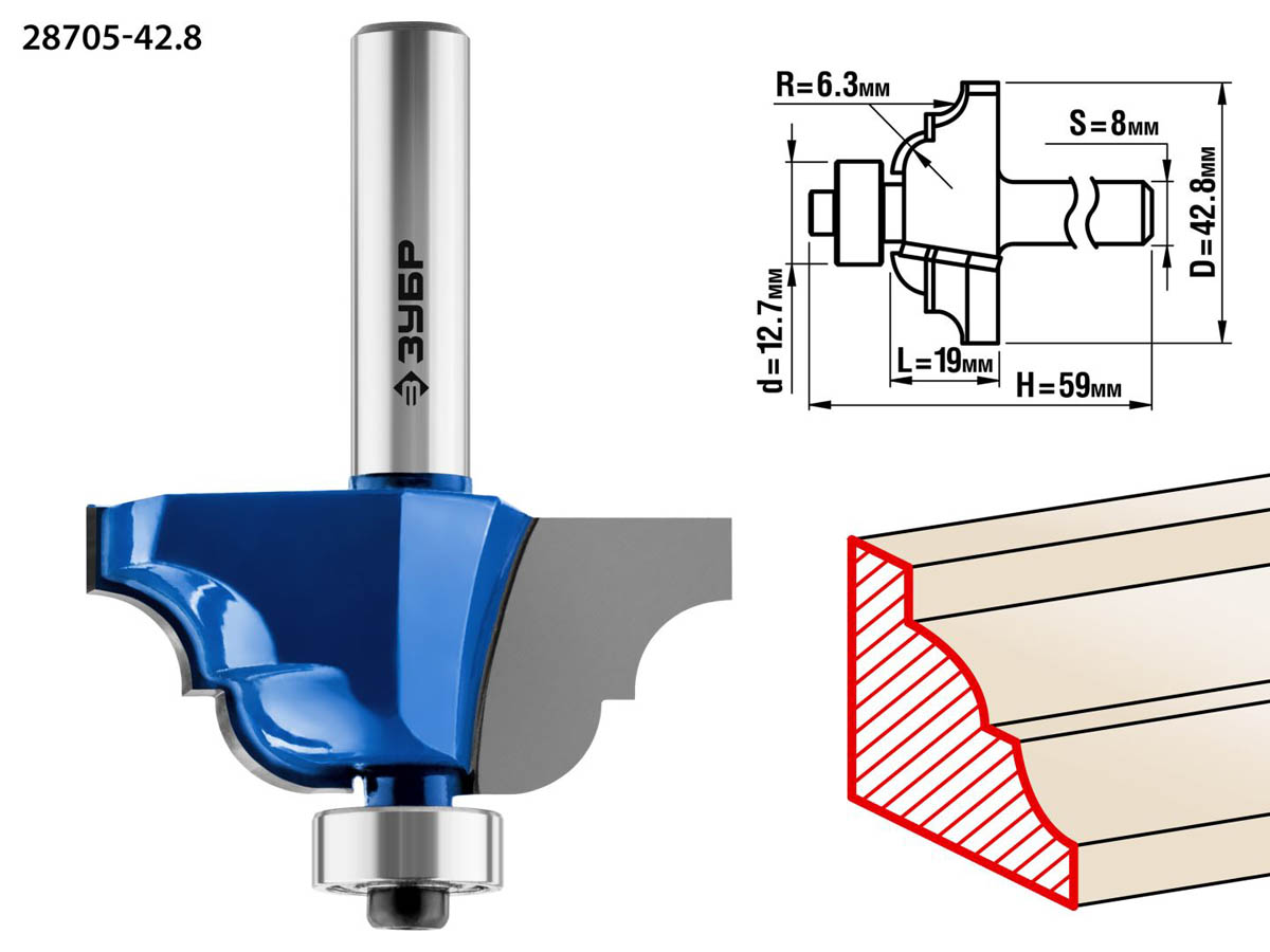 Фреза кромочная калевочная №4, D= 42,8мм, рабочая длина-19мм, радиус-6,3мм, хв.-8мм, d-12,7мм, ЗУБР Профессионал