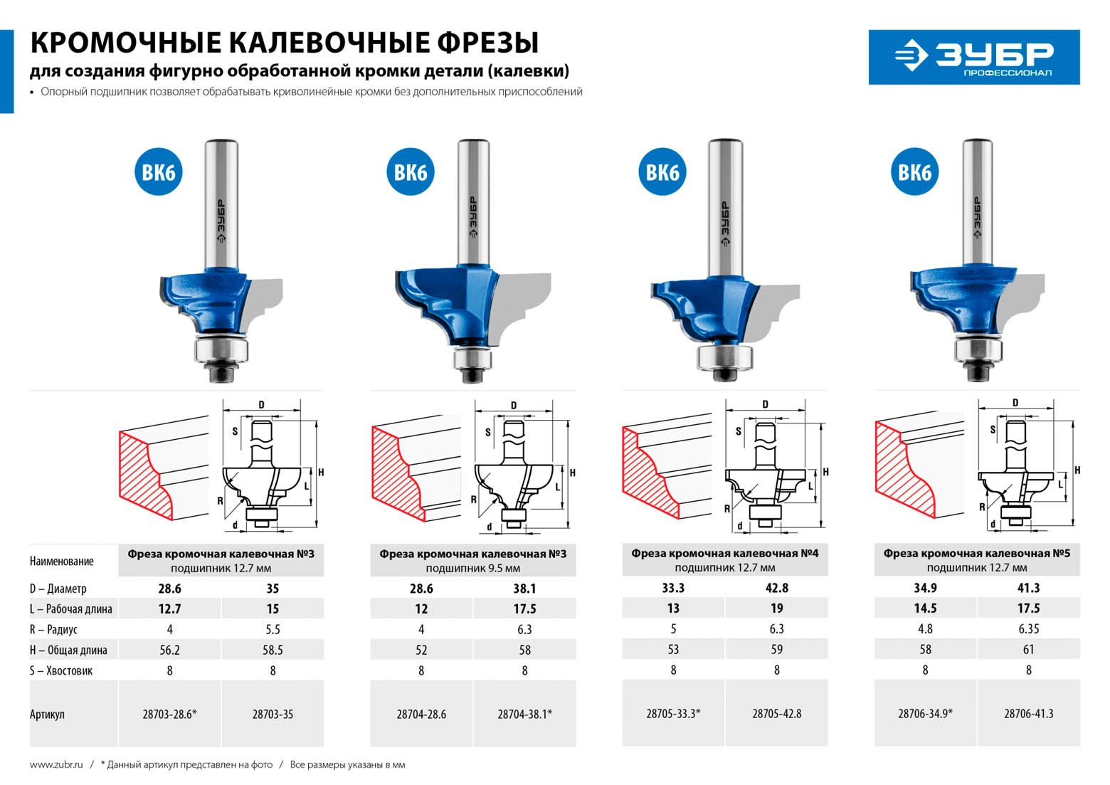 Фреза кромочная калевочная №4 ЗУБР 28705-42.8, предназначена для скругления кромок при обработке столешниц, полок, шкафов и прочих работ с разнообразными видами древесины. Высококачественный твердый сплав для повышенного ресурса и чистоты обработки. Заточка производится только на самых современных станках с ЧПУ. Упорный подшипник позволяет обрабатывать криволинейные кромки без дополнительных приспособлений.