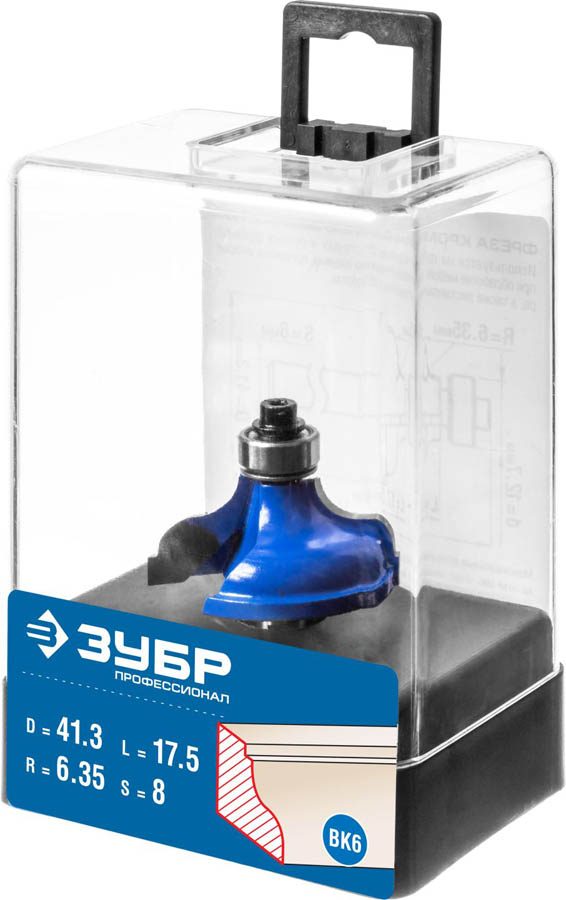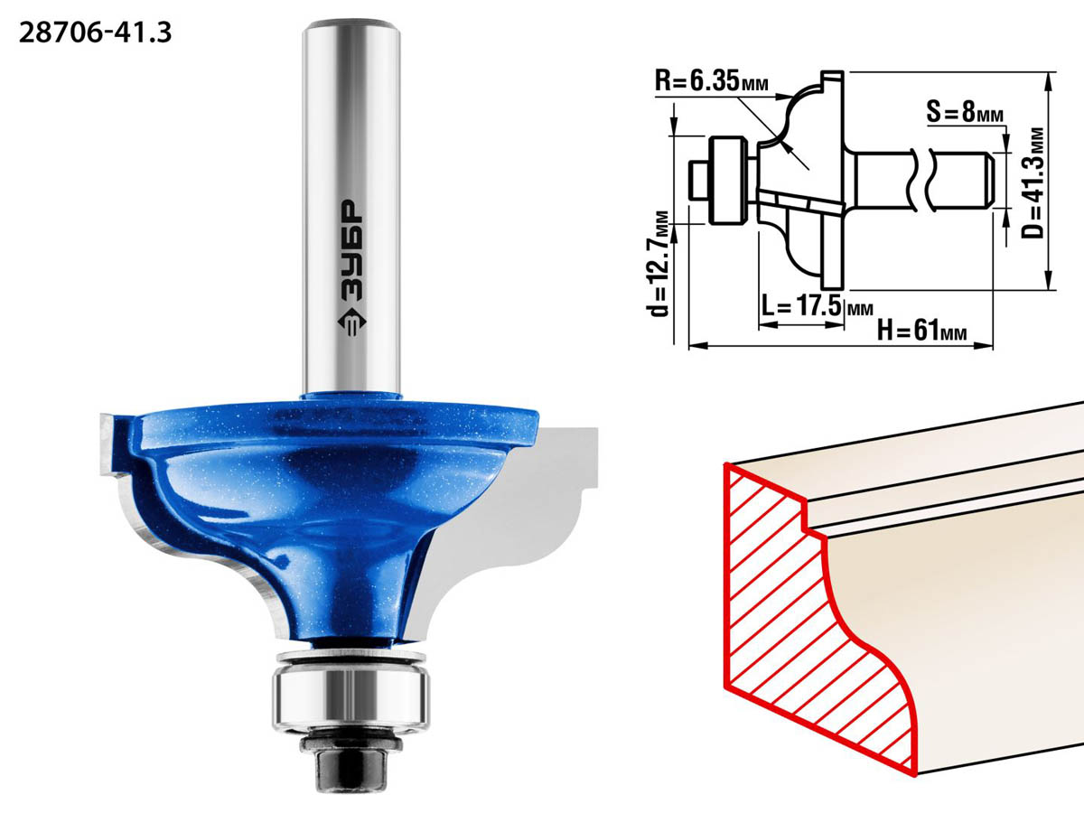 Фреза кромочная калевочная №5, D= 41,3мм, рабочая длина-17,5мм, радиус-6,35мм, хв.-8мм, d-12,7мм, ЗУБР Профессионал