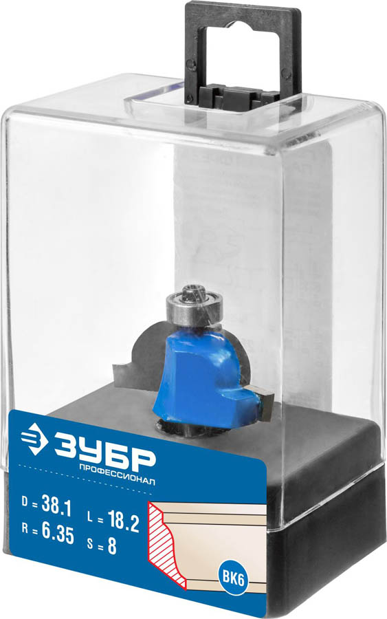 Фреза кромочная калевочная №6, D= 38,1мм, рабочая длина-16,2мм, радиус-6,35мм, хв.-8мм, d-12,7мм, ЗУБР Профессионал