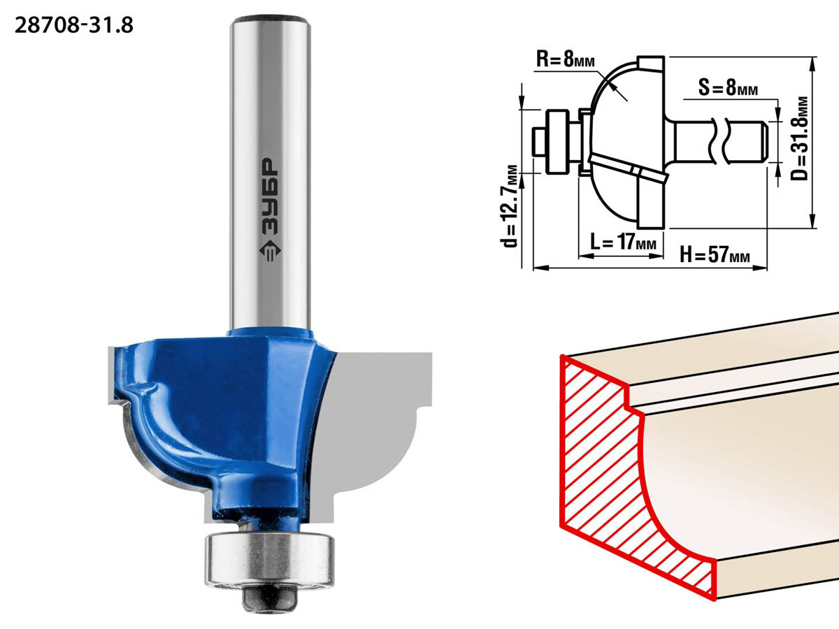 Фреза кромочная калевочная №7 ЗУБР 28708-31.8, предназначена для скругления кромок при обработке столешниц, полок, шкафов и прочих работ с разнообразными видами древесины Высококачественный твердый сплав для повышенного ресурса и чистоты обработки