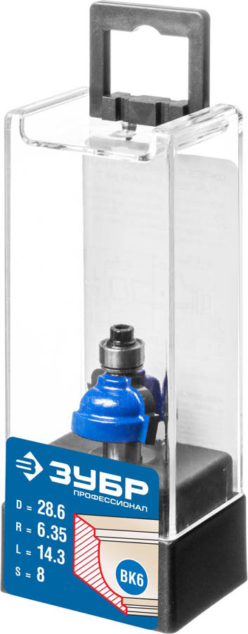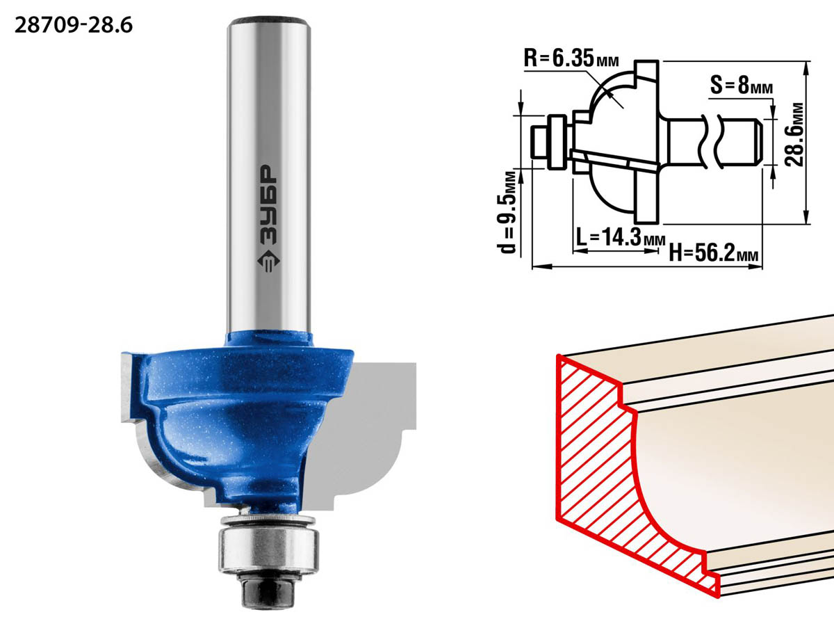 Фреза кромочная калевочная №7, D= 28,6мм, рабочая длина-14,3мм, радиус-6,35мм, хв.-8мм, d-9,5мм, ЗУБР Профессионал
