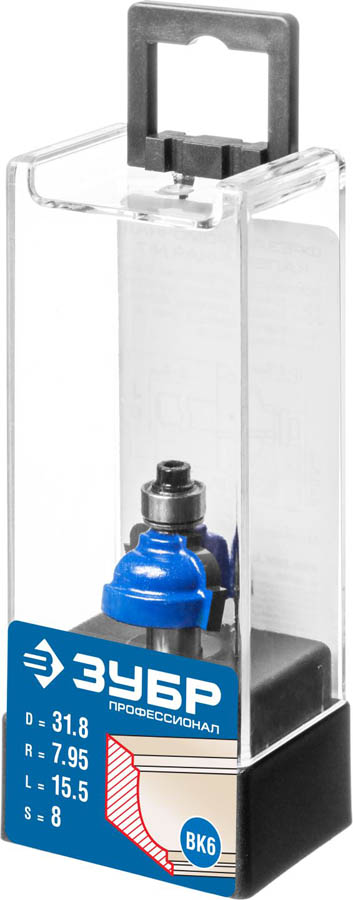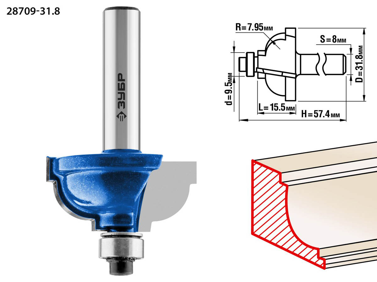 Фреза кромочная калевочная №7, D= 31,8мм, рабочая длина-15,5мм, радиус-7,95мм, хв.-8мм, d-9,5мм, ЗУБР Профессионал