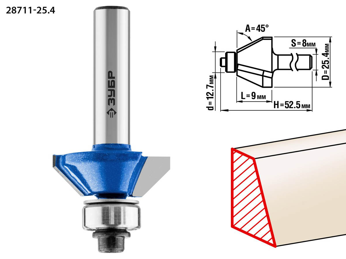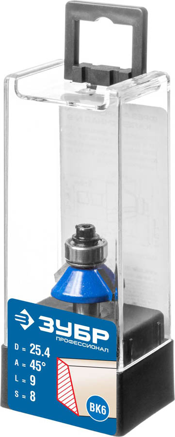 Фреза кромочная калевочная(фасочная) №9, D= 25,4мм, рабочая длина-9мм, угол наклона-45 градусов, хв.-8мм, d-12,7мм, ЗУБР Профессионал