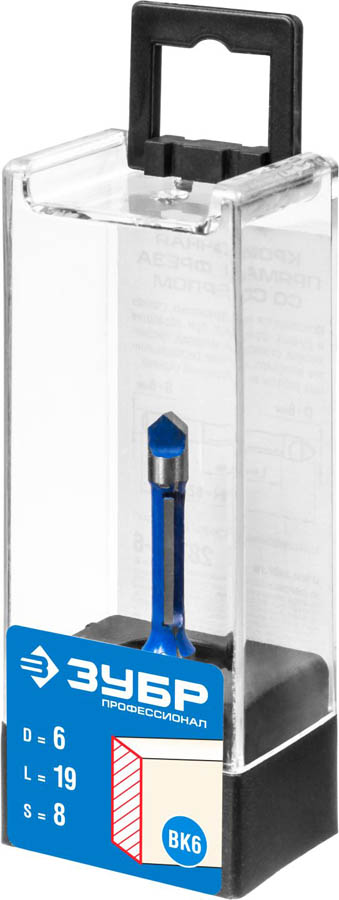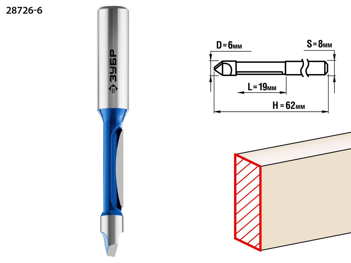 Фреза кромочная прямая со сверлом, D= 6мм, рабочая длина-19мм, хв.-8 мм, ЗУБР Профессионал