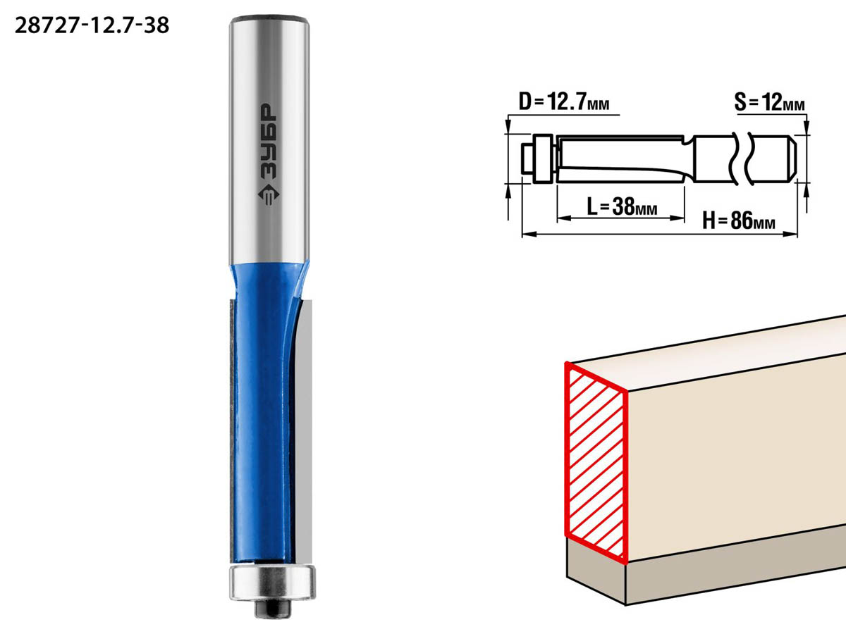 Фреза кромочная с нижним подшипником, D= 12,7мм, рабочая длина-38мм, хв.-12мм, d-12,7мм, ЗУБР Профессионал