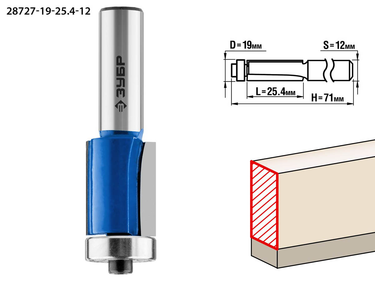 Фреза кромочная с нижним подшипником, D= 19мм, рабочая длина-25,4мм, хв.-12мм, d-19мм, ЗУБР Профессионал