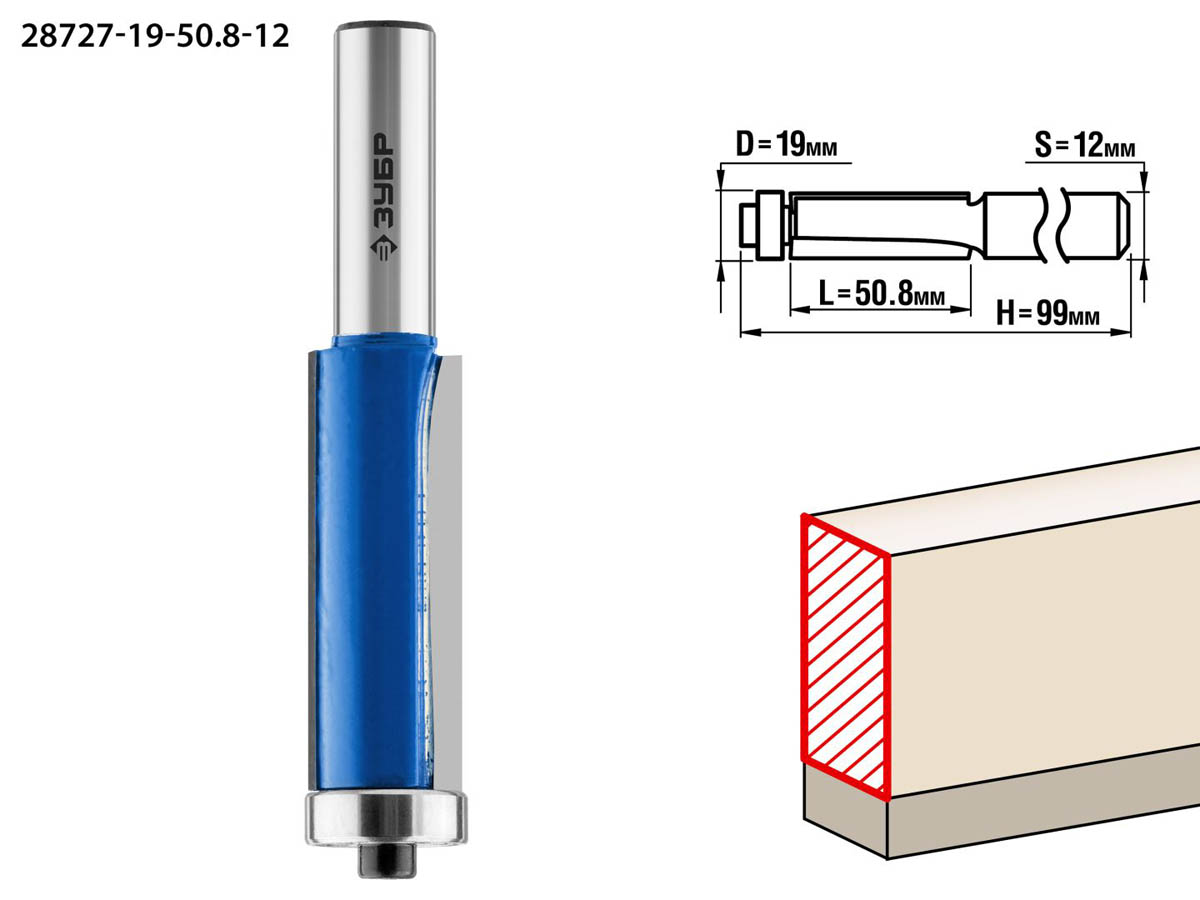 Фреза кромочная с нижним подшипником, D= 19мм, рабочая длина-50,8мм, хв.-12мм, d-19мм, ЗУБР Профессионал