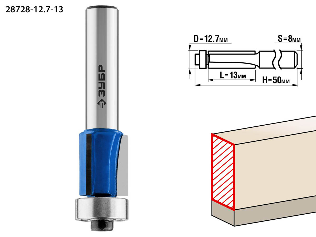 Фреза кромочная с нижним подшипником(3 лезвия), D= 12,7мм, рабочая длина-13мм, хв.-8мм, d-12,7мм, ЗУБР Профессионал
