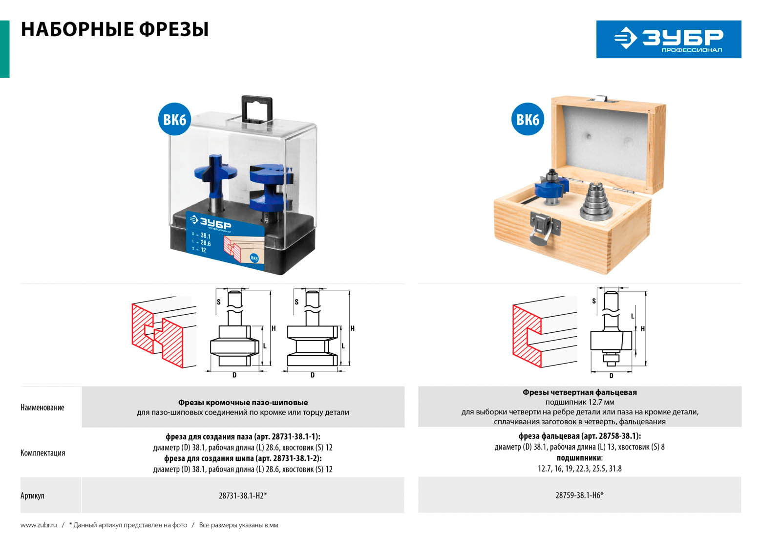 Набор фрез пазо-шиповых ЗУБР 28731-38.1-H2, для обработки торцев и кромок и сращивания деталей по торцу при работе с различными видами древесины. Высококачественный твердый сплав для повышенного ресурса и чистоты обработки. Заточка производится только на самых современных станках с ЧПУ.
