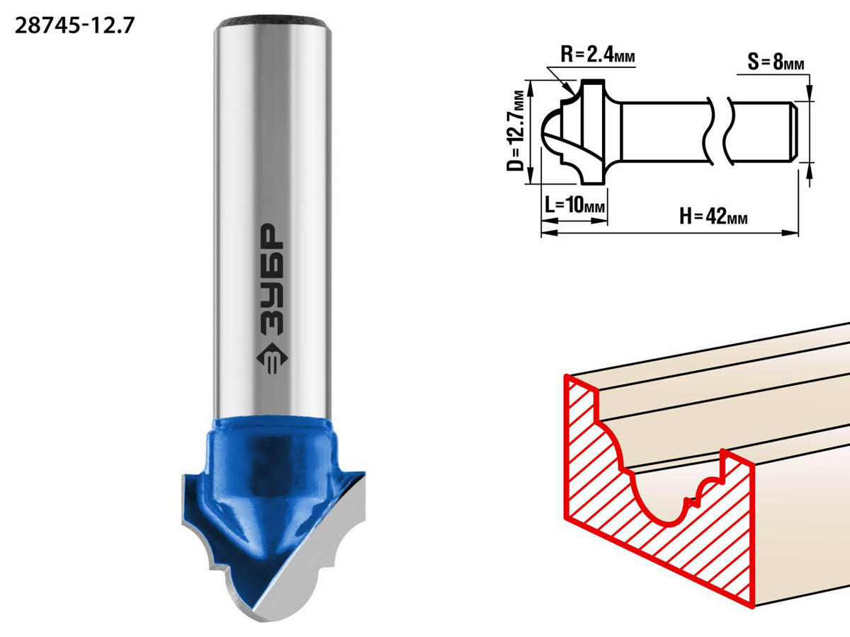 Фреза пазовая фасонная №6, D= 12,7мм, рабочая длина-10мм, радиус-2,4мм, хв.-8 мм, ЗУБР Профессионал