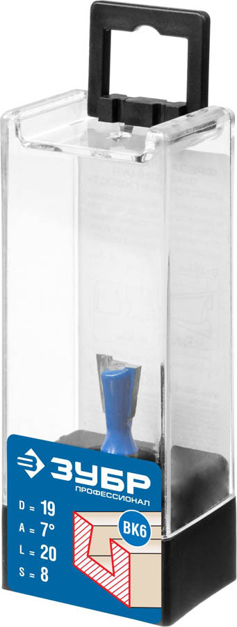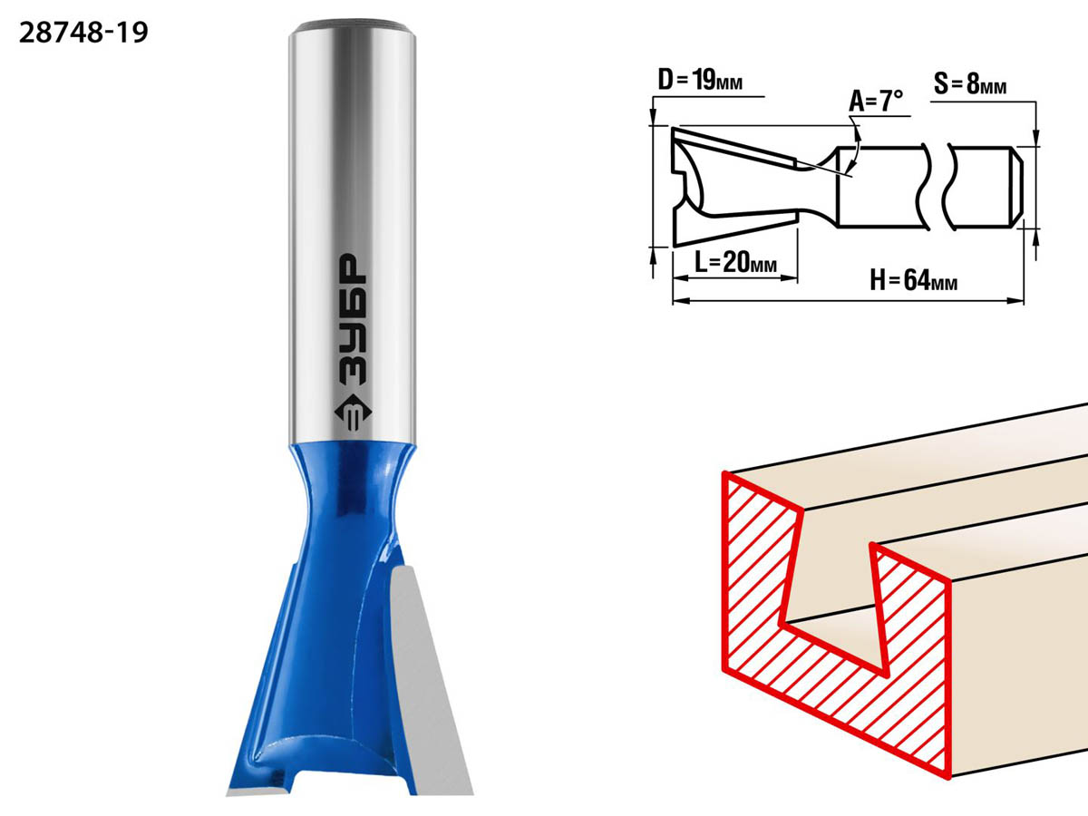 Фреза пазовая фасонная "Ласточкин Хвост", D= 19мм, рабочая длина-20мм, обратный угол-7 градусов, хв.-8 мм, ЗУБР Профессионал