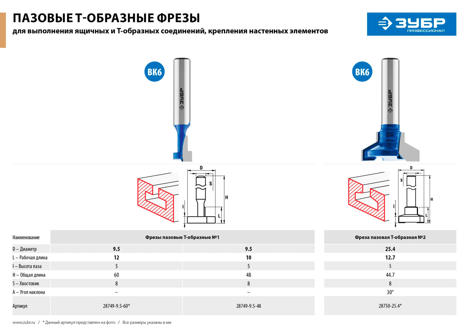 Фреза пазовая Т-образная №1 ЗУБР 28749-9.5-48, предназначена для выборки канавок, создании шиповых соединений при работе с различными видами древесины. Особенно удобна при фрезеровании по шаблонам. Высококачественный твердый сплав для повышенного ресурса и чистоты обработки. Заточка производится только на самых современных станках с ЧПУ.