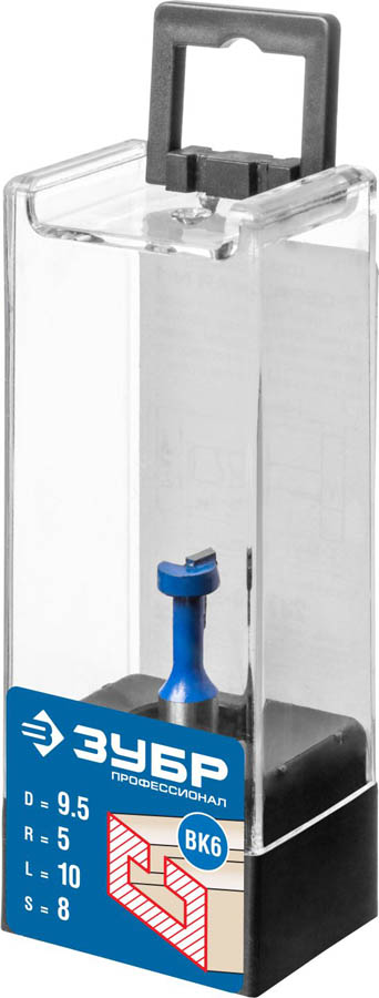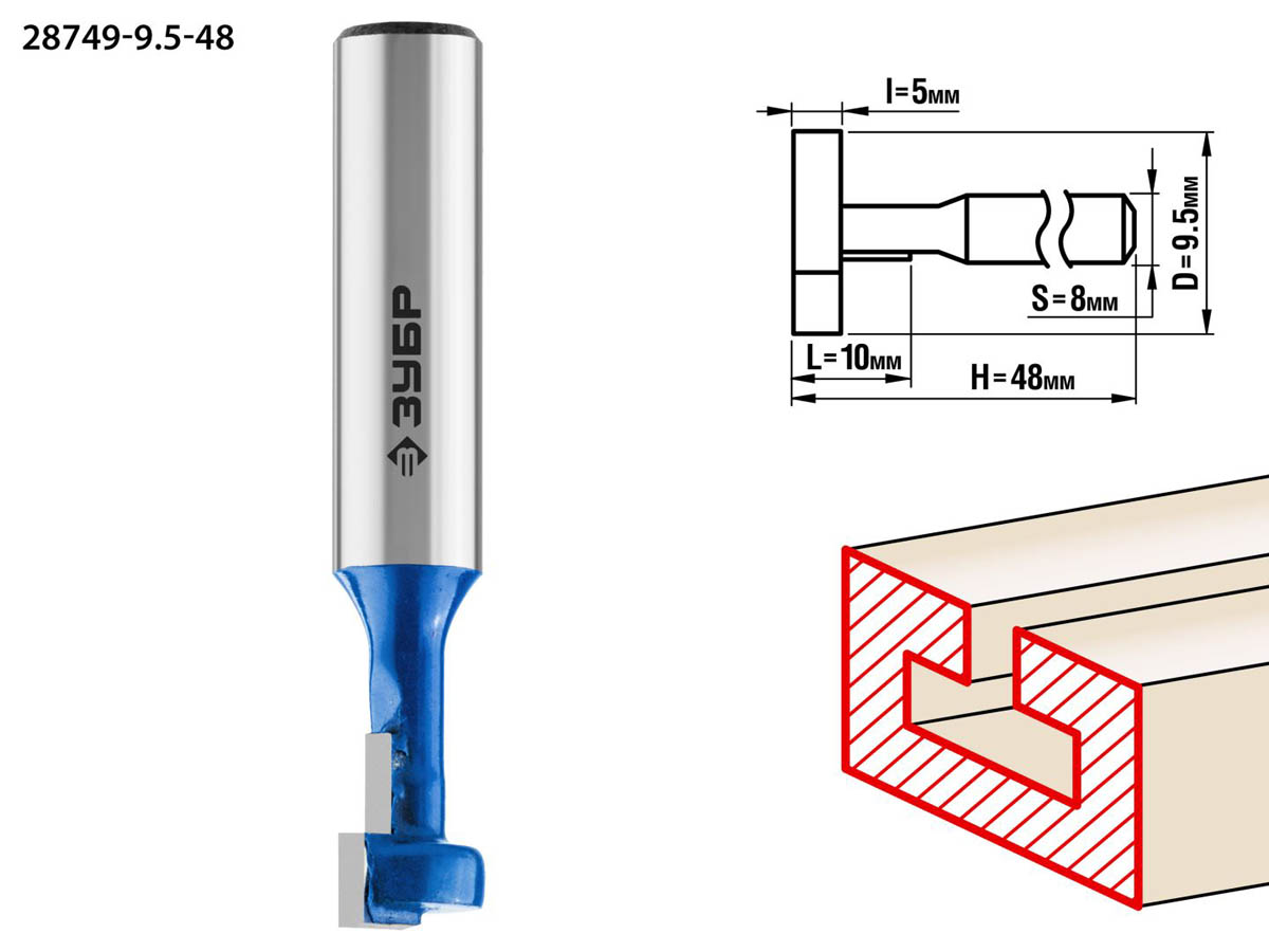 Фреза пазовая Т-образная №1, D= 9,5мм, общая длина-48мм, рабочая длина-10мм, хв.-8 мм, ЗУБР Профессионал
