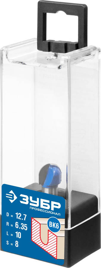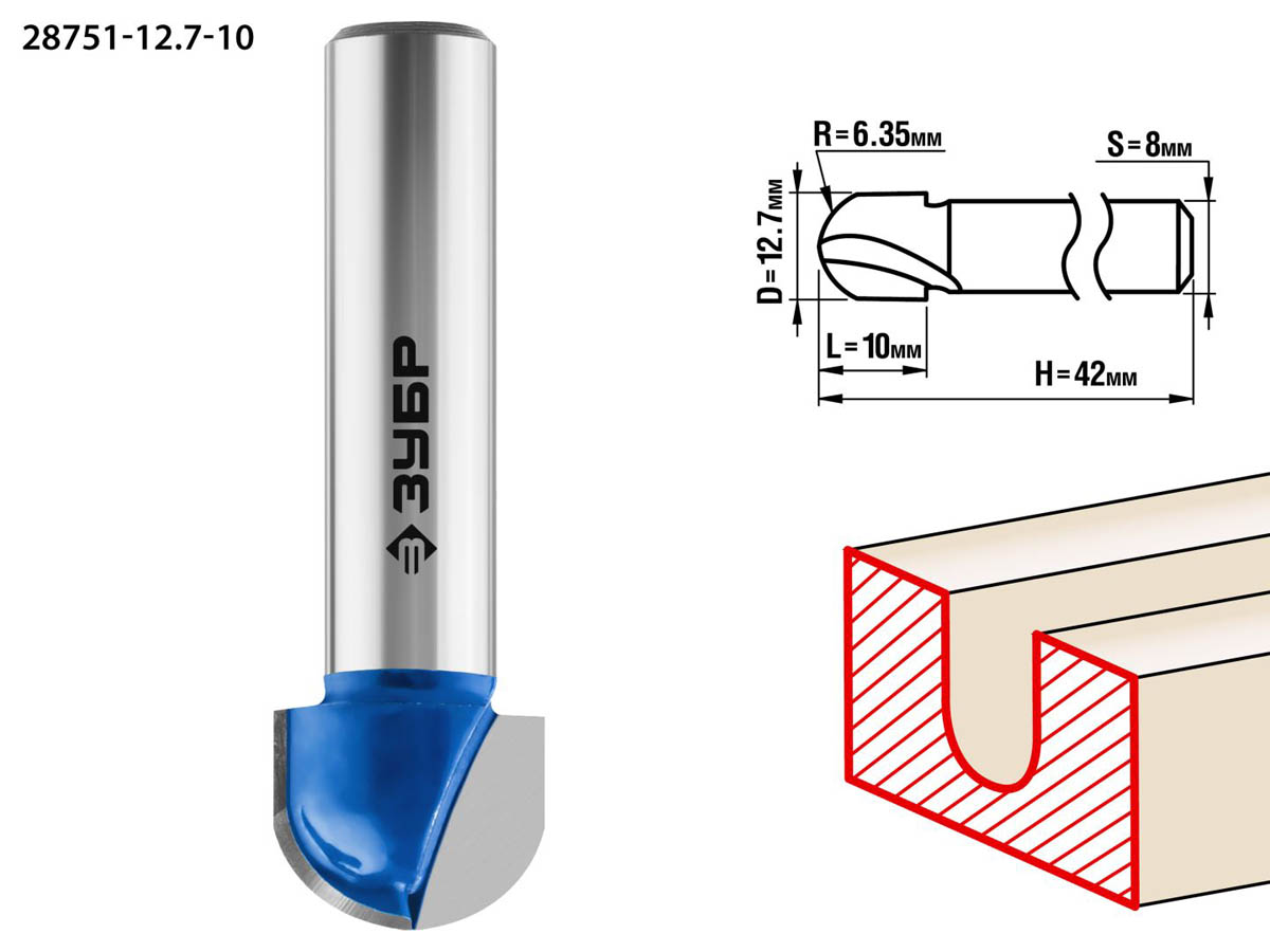 Фреза пазовая галтельная, D= 12,7мм, рабочая длина-10мм, радиус-6,35мм, хв.-8 мм, ЗУБР Профессионал