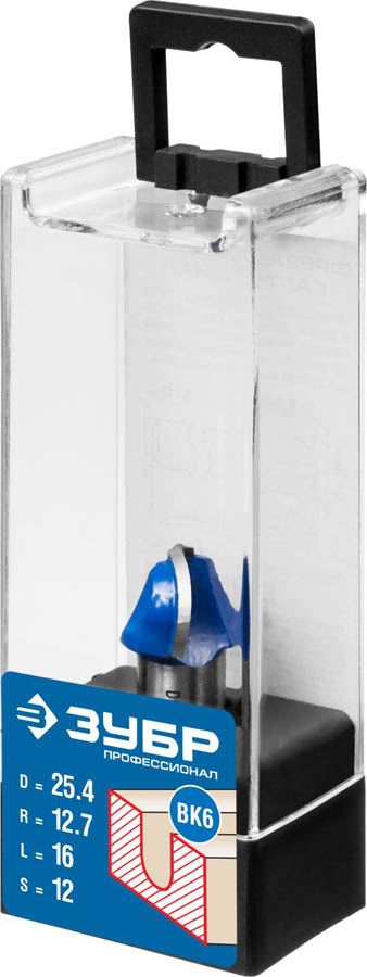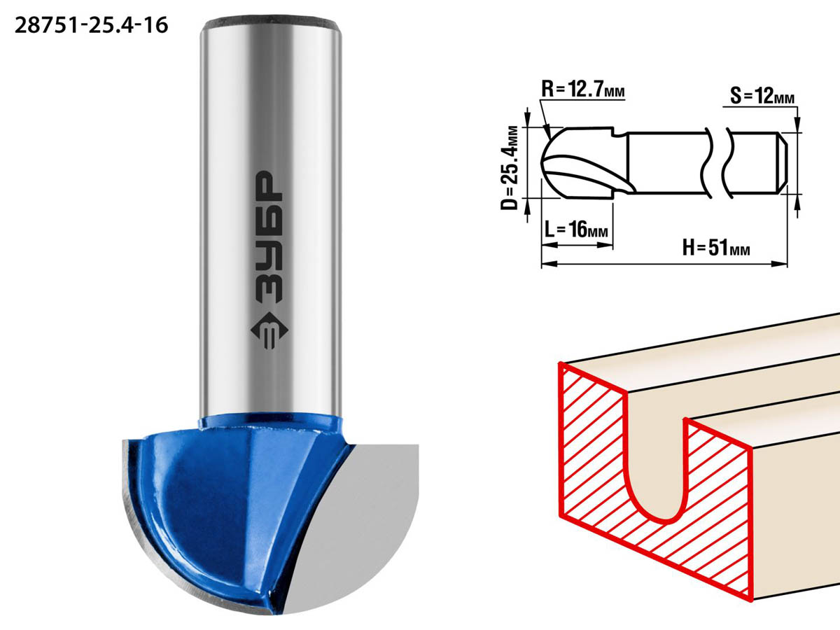 Фреза пазовая галтельная, D= 25,4мм, рабочая длина-16мм, радиус-12,7мм, хв.-12 мм, ЗУБР Профессионал