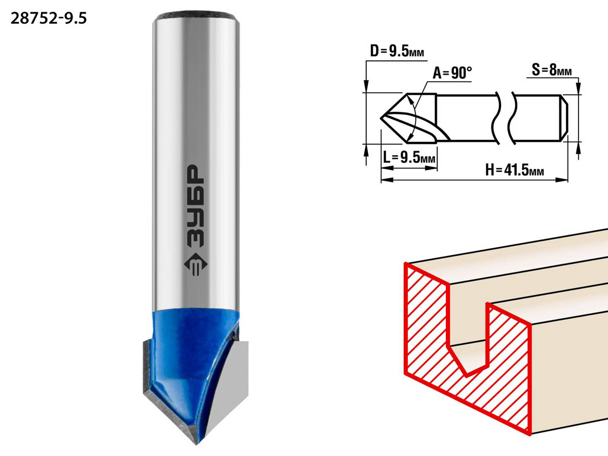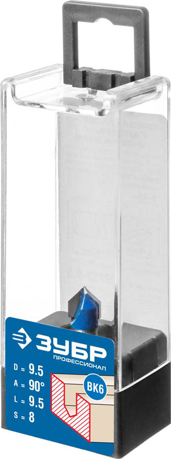 Фреза пазовая галтельная V-образная, D= 9,5мм, рабочая длина-9,5мм, угол-90° градусов, хв.-8 мм, ЗУБР Профессионал
