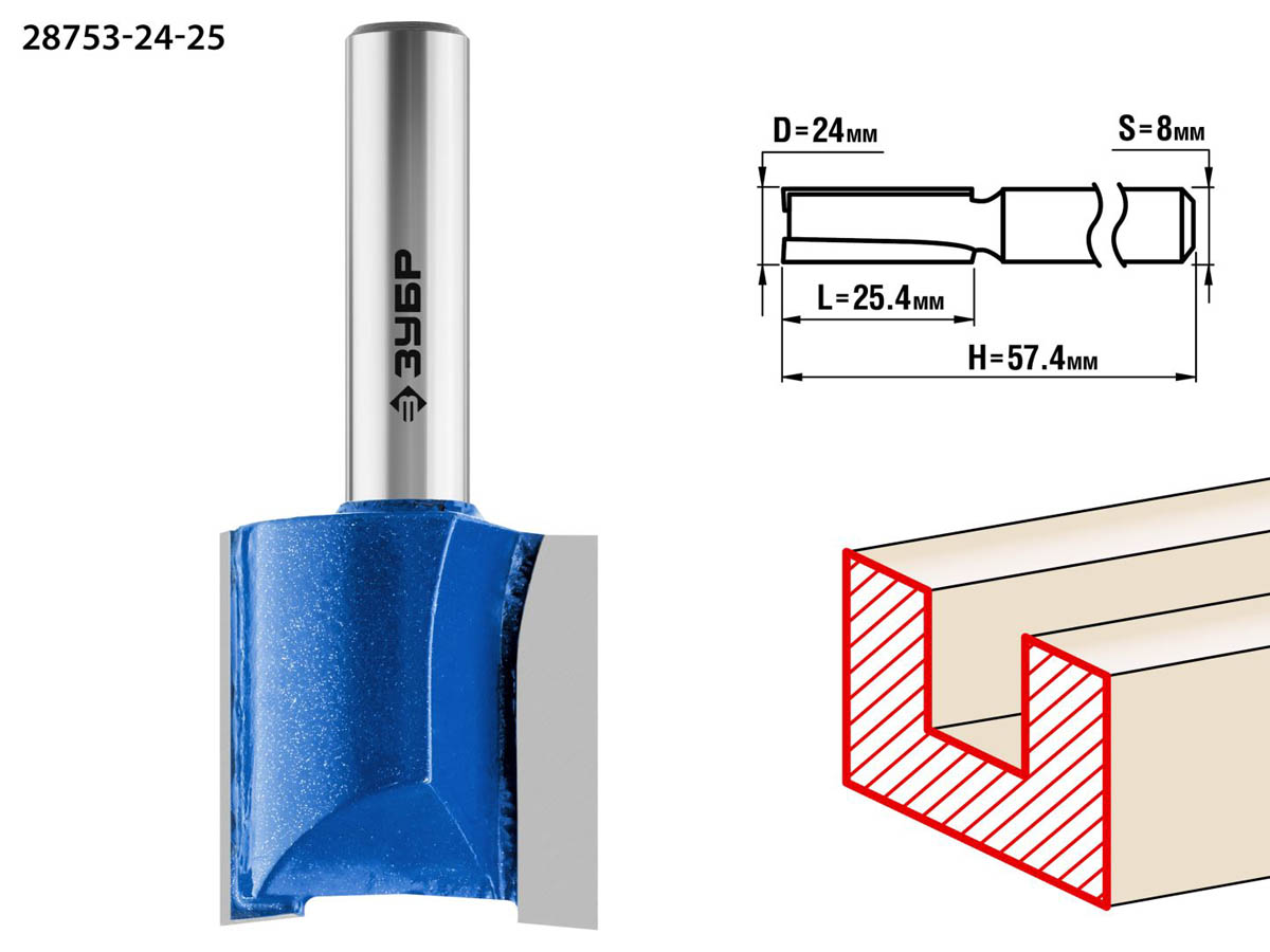 Фреза пазовая прямая, D= 24мм, рабочая длина-25мм, хв.-8 мм, ЗУБР Профессионал
