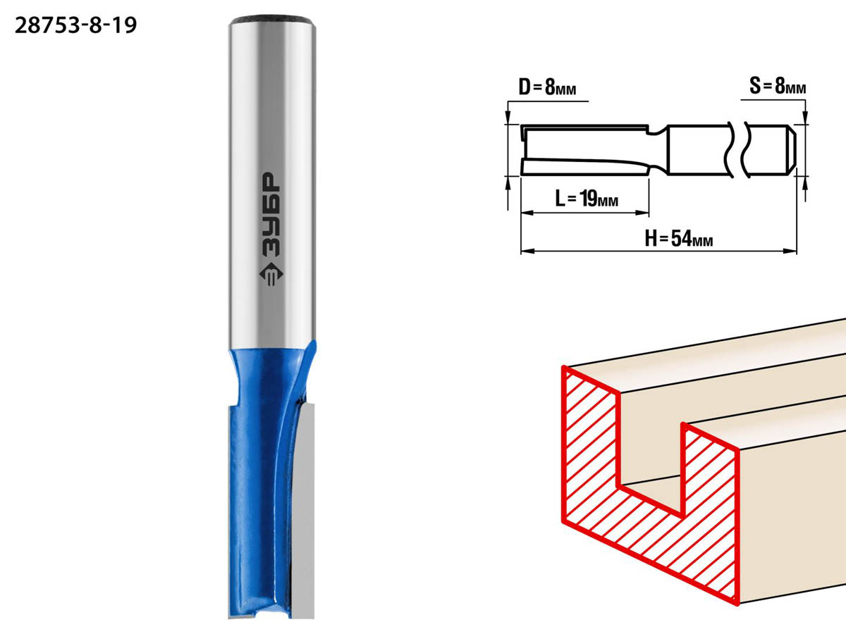 Фреза пазовая прямая, D= 8мм, рабочая длина-19мм, хв.-8 мм, ЗУБР Профессионал