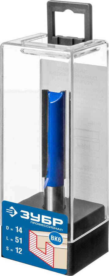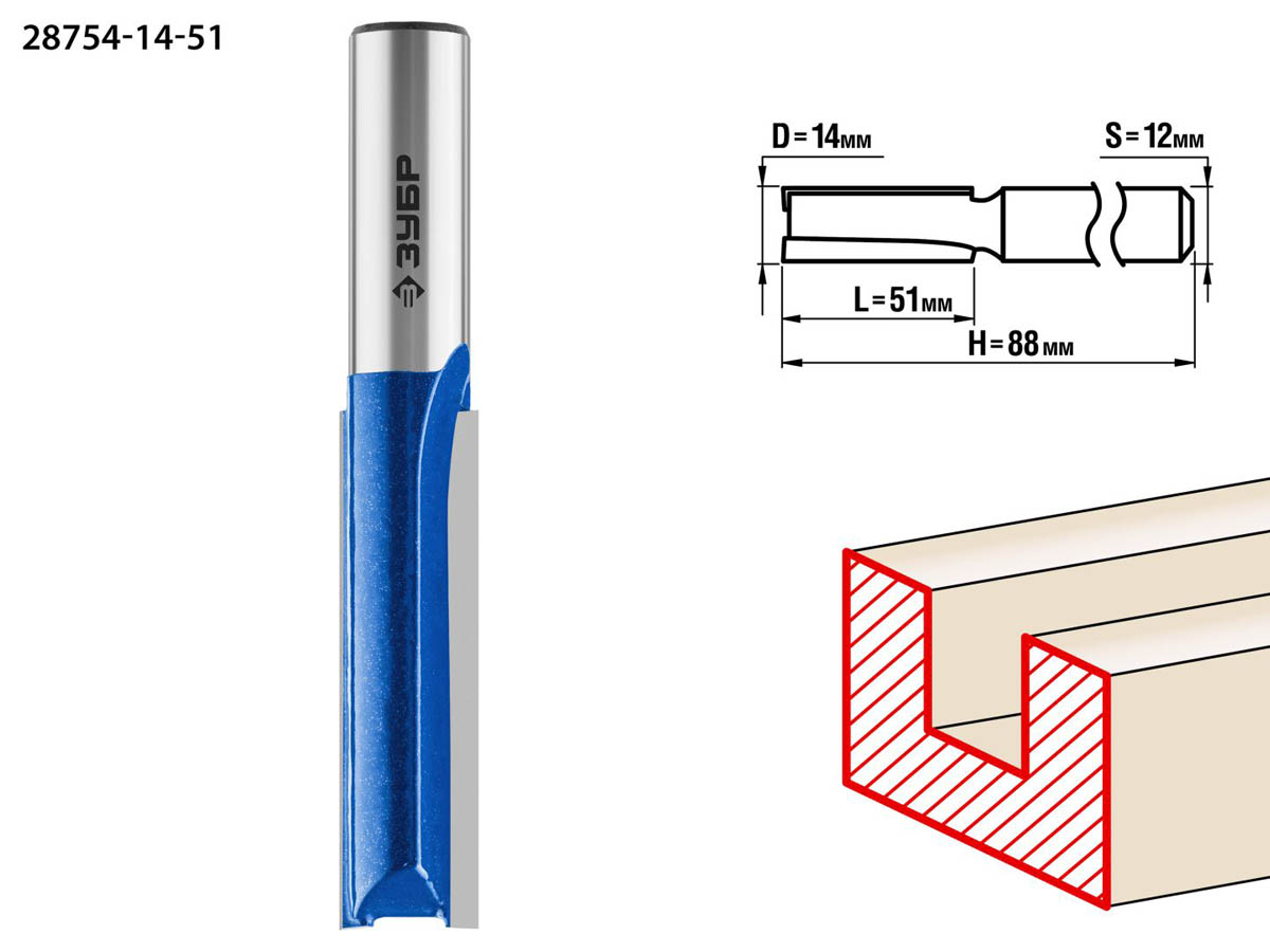 Фреза пазовая прямая, удлиненная, D= 14мм, рабочая длина-51мм, хв.-12 мм, ЗУБР Профессионал