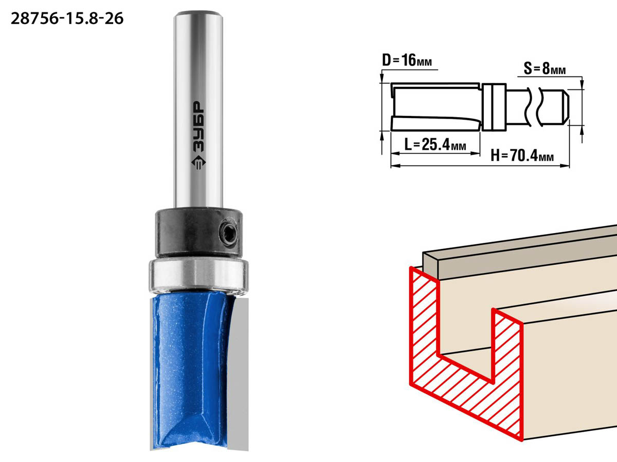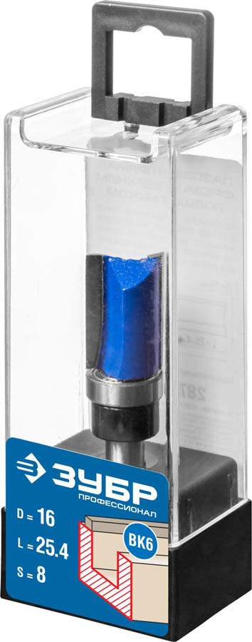 Фреза пазовая прямая с верхним подшипником, D= 16мм, рабочая длина-25,4мм, хв.-8мм, d-15,8мм, ЗУБР Профессионал