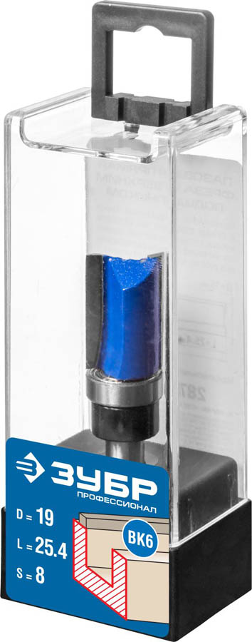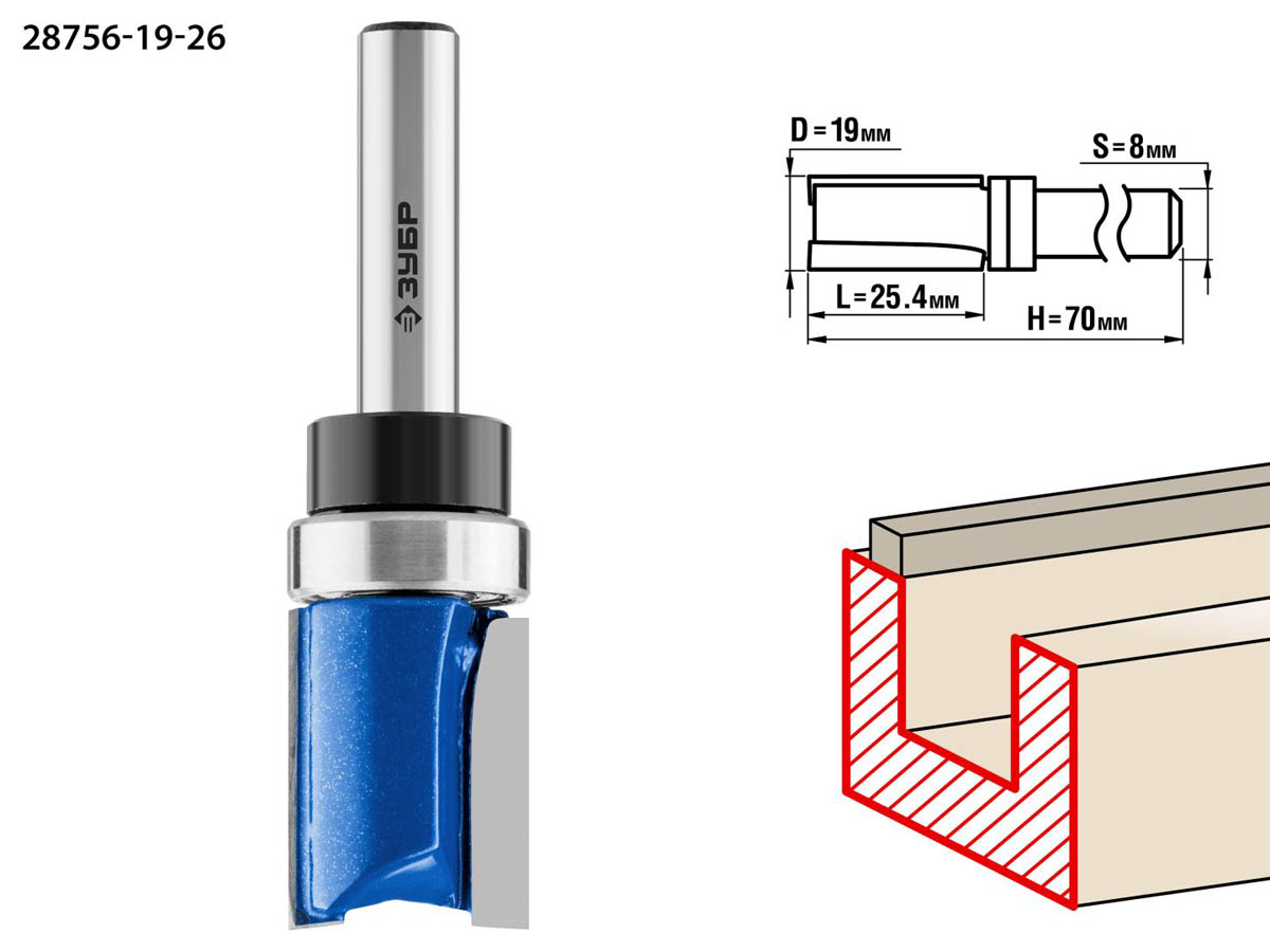 Фреза пазовая прямая с верхним подшипником, D= 19мм, рабочая длина-25,4мм, хв.-8мм, d-19мм, ЗУБР Профессионал