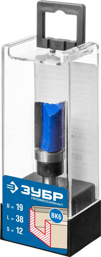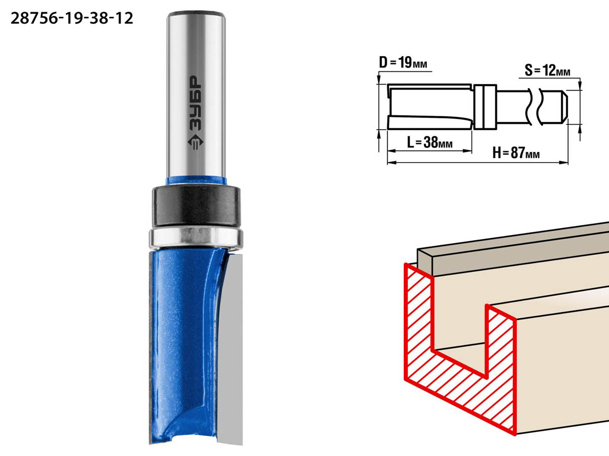 Фреза пазовая прямая с верхним подшипником, D= 19мм, рабочая длина-38мм, хв.-12мм, d-19мм, ЗУБР Профессионал