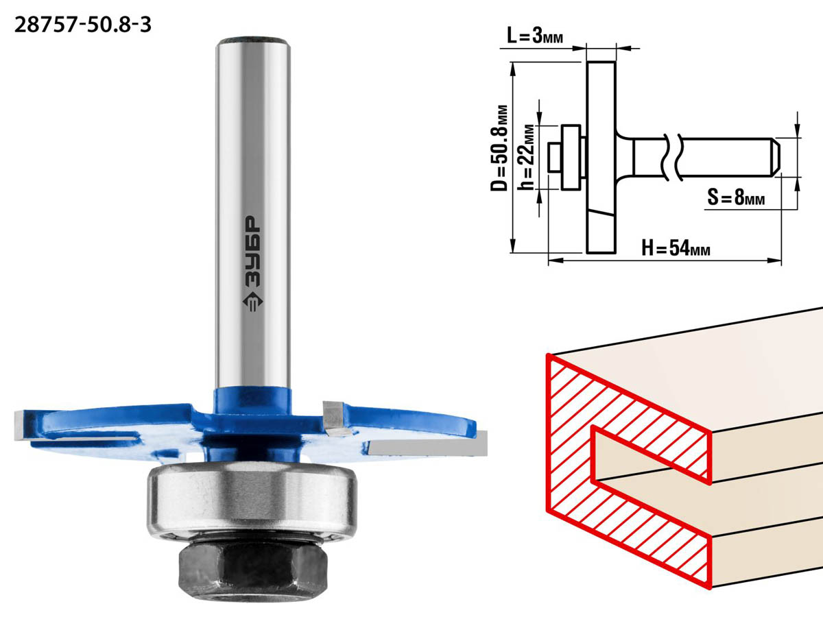Фреза горизонтально-пазовая, D= 50,8мм, высота-3мм, хв.-8мм, d-22мм, ЗУБР Профессионал