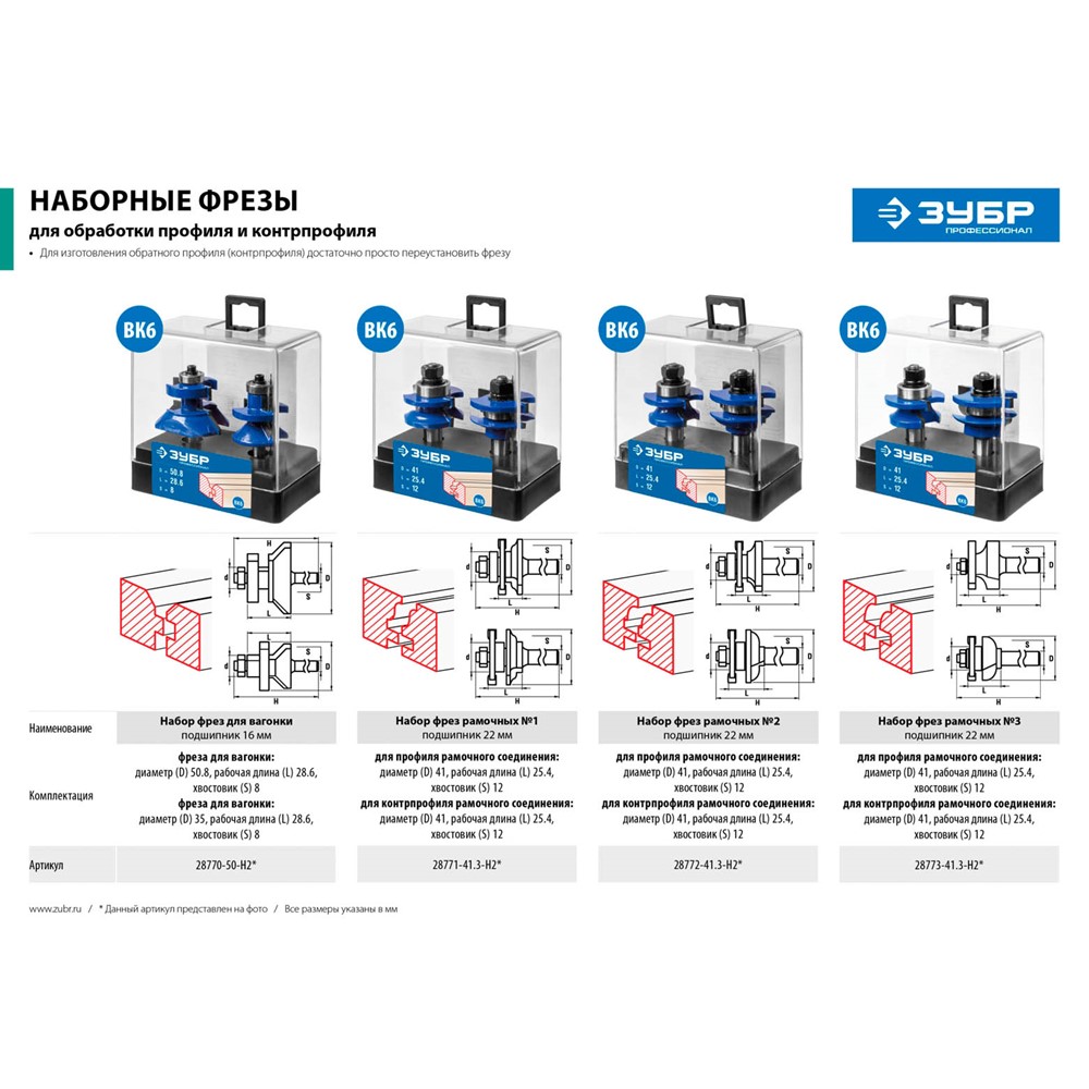 Набор фрез рамочных №1 ЗУБР 28771-41.3-H2, предназначен для изготовления профиля и обратного профиля для рамочных соединений при работе с различными видами древесины. Высококачественный твердый сплав для повышенного ресурса и чистоты обработки. Заточка производится только на самых современных станках с ЧПУ. Упорный подшипник позволяет обрабатывать криволинейные кромки без дополнительных приспособлений.