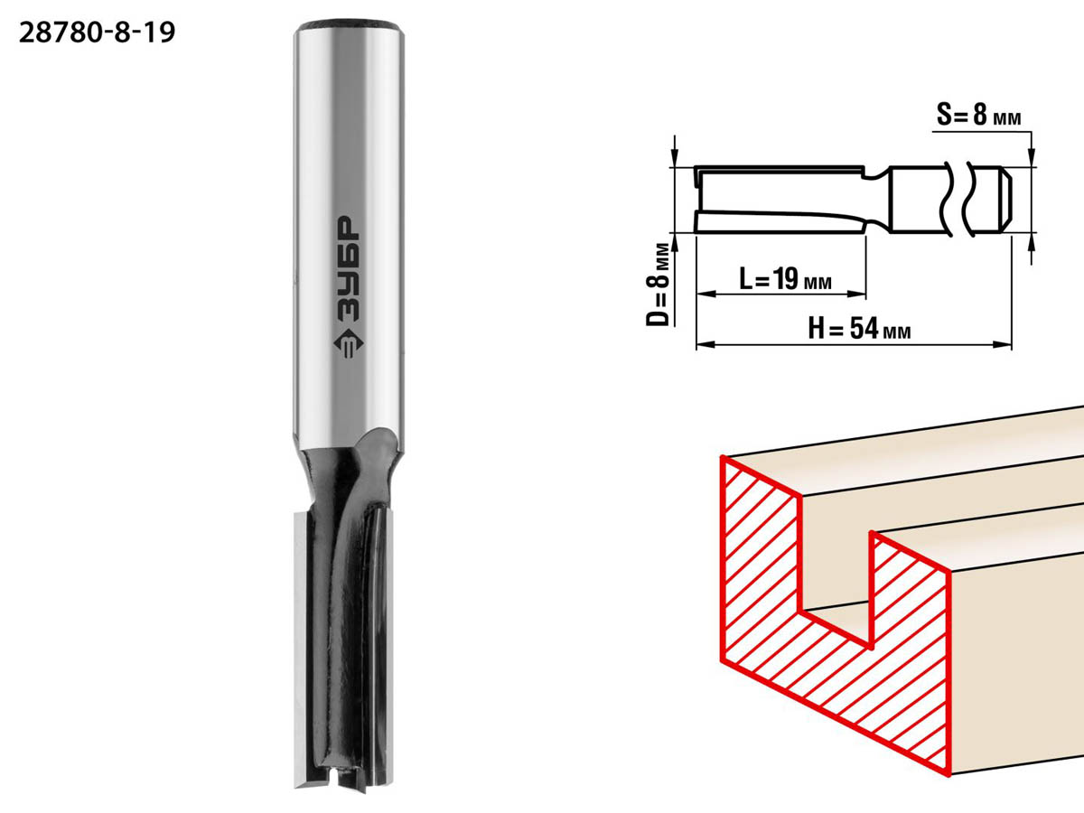 Фреза пазовая прямая, D=8 мм, рабочая длина-19 мм, хв.-8 мм, ЗУБР Профессионал