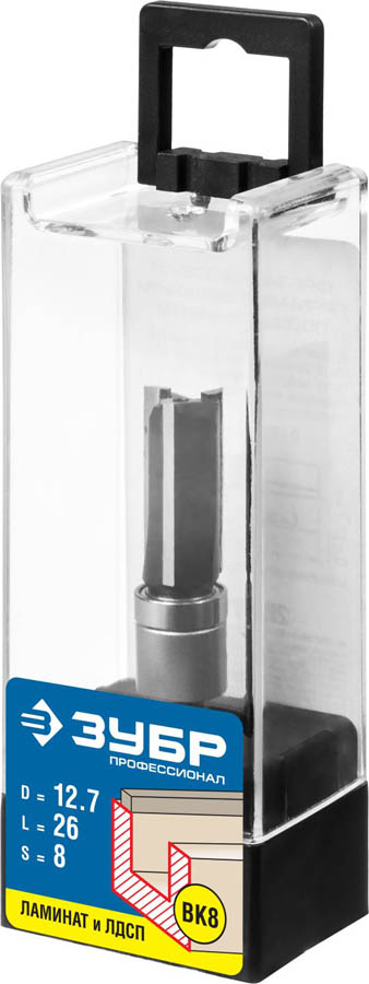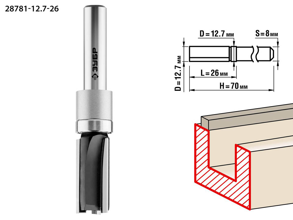 Фреза пазовая прямая с верхним подшипником, D=12,7 мм, рабочая длина-26 мм, хв.-8 мм, d-12,7 мм, ЗУБР Профессионал