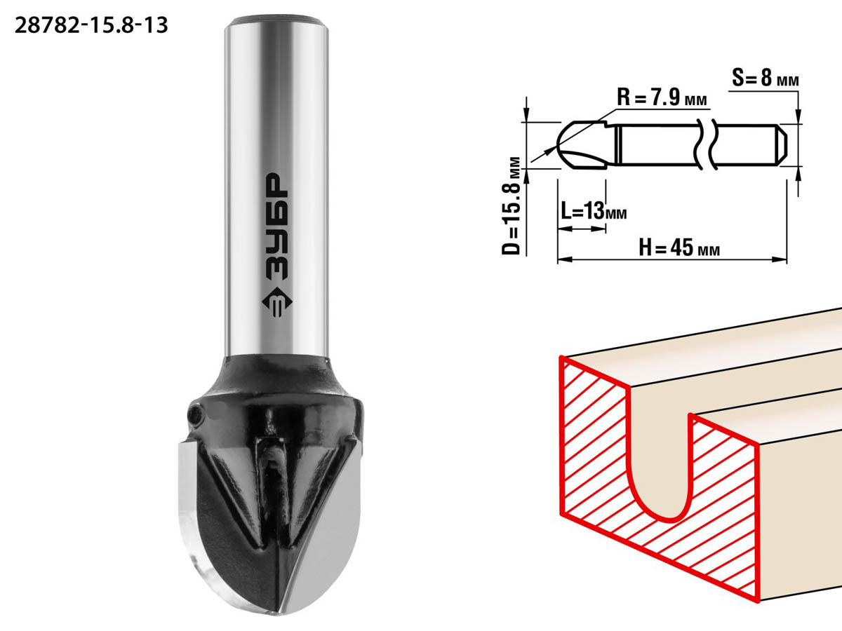 Фреза пазовая галтельная, D=15,8 мм, рабочая длина-13 мм, радиус-7,9 мм, хв.-8 мм, ЗУБР Профессионал