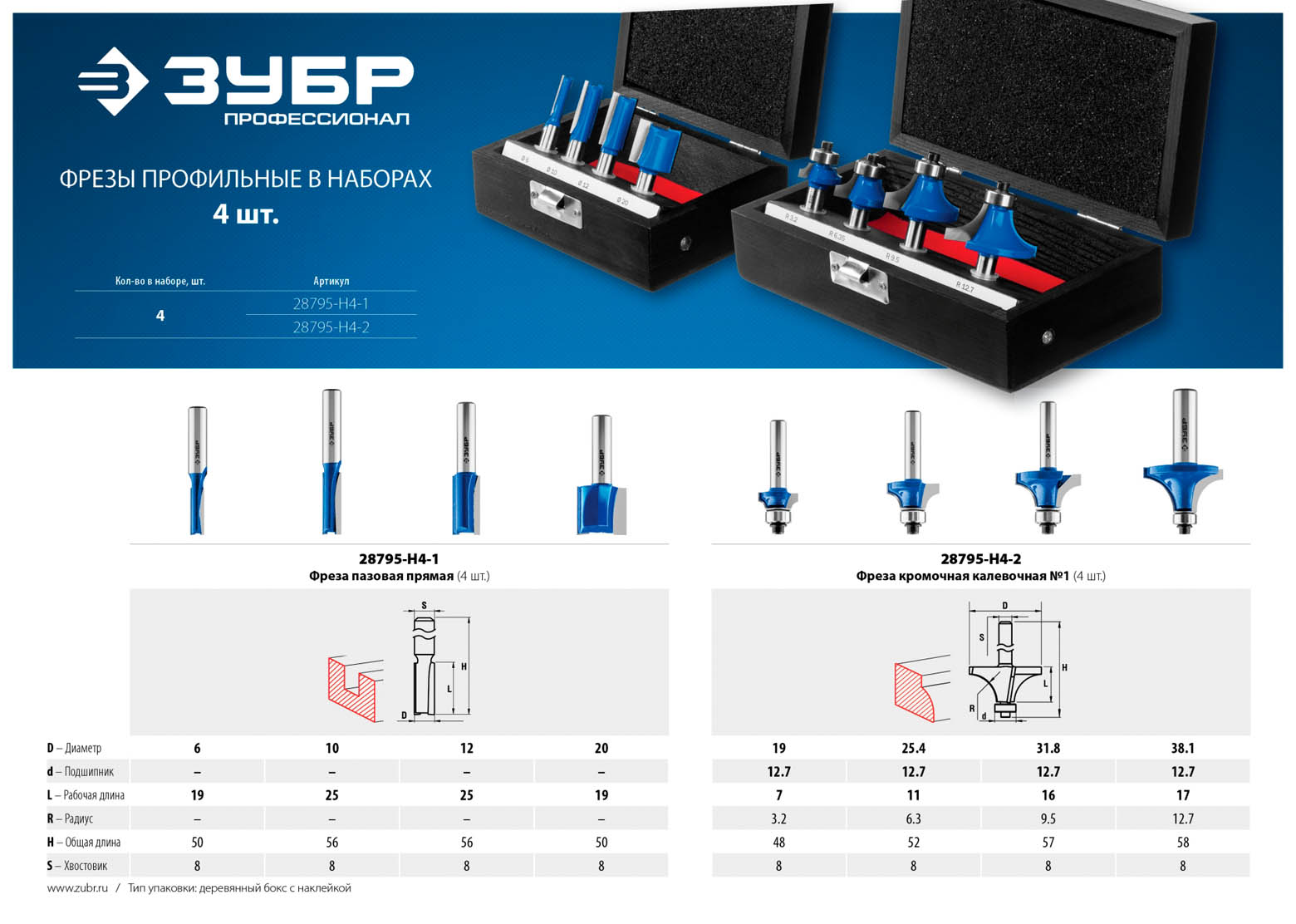 Набор профильных фрез по дереву ЗУБР "ПРОФЕССИОНАЛ", 4 шт (28795-H4-1, )