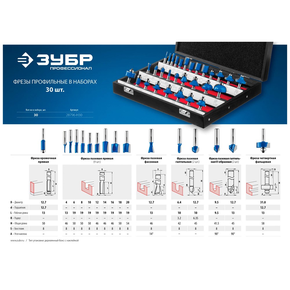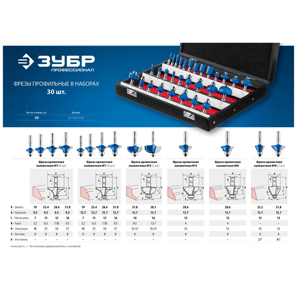 Набор профильных фрез по дереву ЗУБР "ПРОФЕССИОНАЛ", 30 шт
