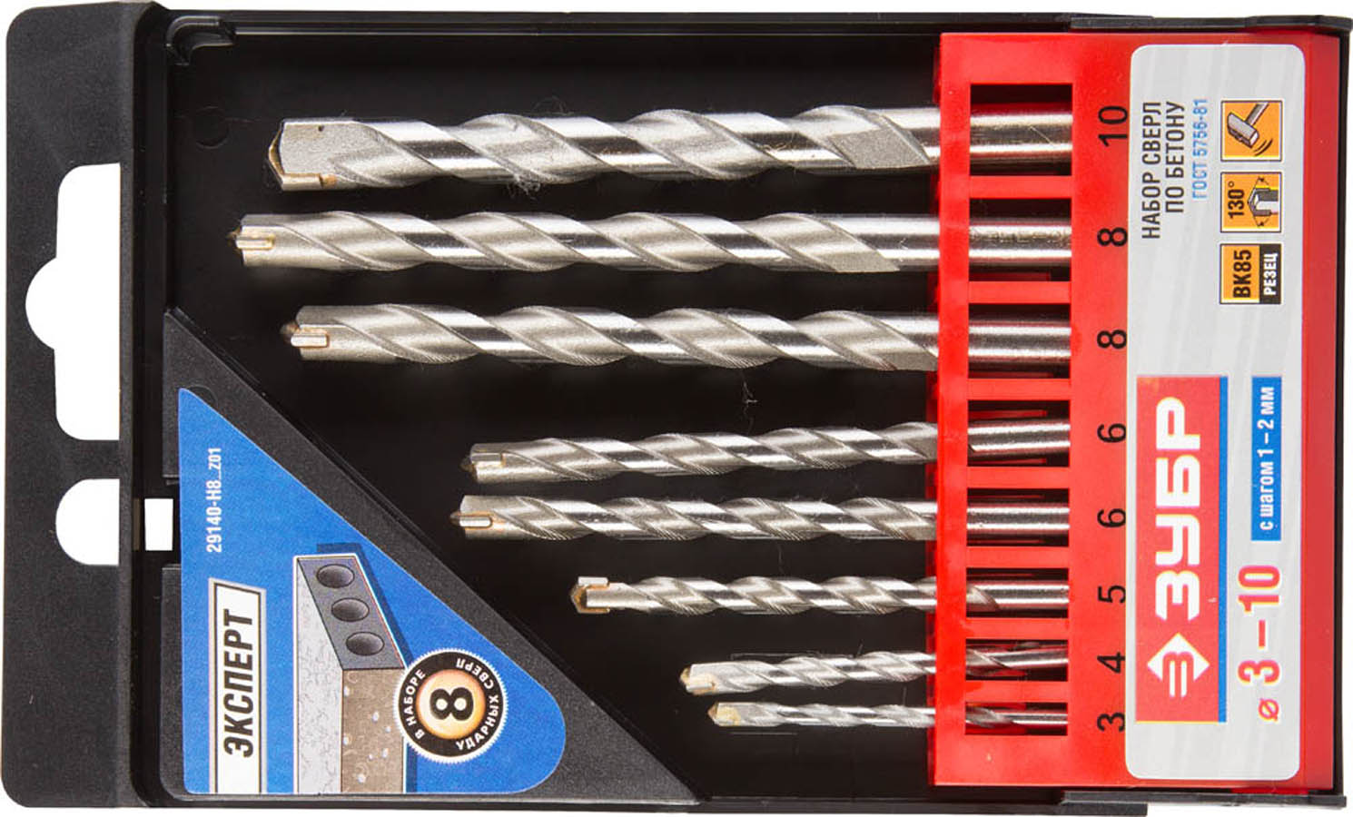 Набор ЗУБР Сверла по бетону ударные, 3-4-5-6-6-8-8-10 мм, пластиковый бокс, 8шт