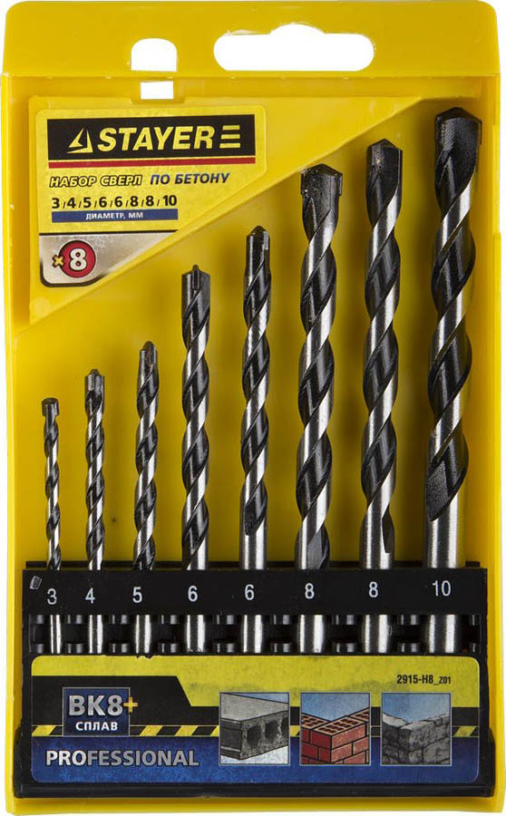 Набор STAYER "PROFESSIONAL": Свёрла по бетону, ударные 3, 4, 5, 6, 6, 8, 8,10мм, 8шт