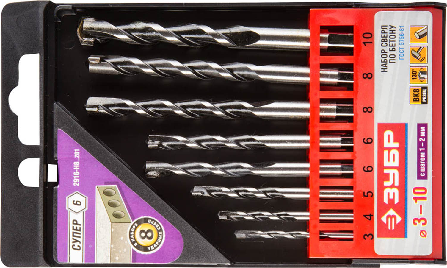 Набор сверел ЗУБР 2916-H8_z01, предназначены для сверления отверстий в бетоне, граните, природном и искусственном камне, кирпиче в режиме сверления с ударом. Твердосплавная пластина ВК8. Усиленная пластина из твердого сплава "ВК8" с углом заточки в 130° существенно увеличивает скорость сверления, а также повышает износостойкость сверла в процессе эксплуатации. Усиленный стальной стержень защищает сверла от деформации при ударных нагрузках. Шлифованный шестигранный хвостовик не допускает проворачивание сверла в сверлильном патроне.