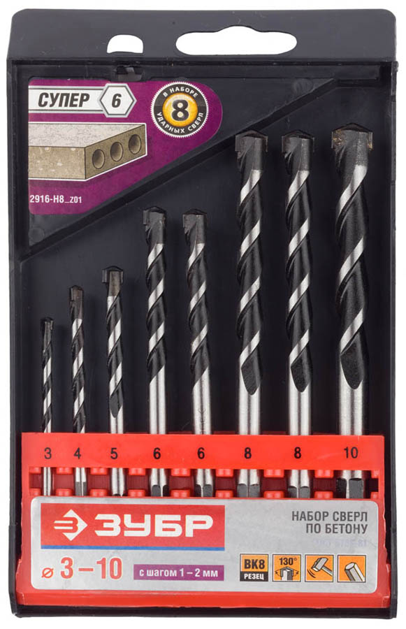 Набор ЗУБР Свёрла "СУПЕР-6" по бетону, ударные, с шестигранным хвостовиком, 3; 4; 5; 6; 6; 8; 8; 10мм, 8шт