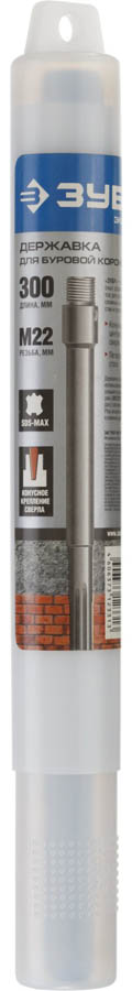 Державка ЗУБР 29188-300_z01 предназначена для использования с коронками по бетону с посадкой М22 и центрирующими сверлами с коническим хвостовиком на перфораторах с зажимом SDS-max и мощностью не менее 1100 Вт для работ по бетону, граниту, природному и искусственному камню, кирпичной кладке в режиме сверления с ударом. Коронки по бетону используются совместно с державками и центрирующими сверлами. Широкий ассортимент оснастки ЗУБР позволяет реализовать самые сложные задачи в работе по бетону, камню и кирпичу. Конусная посадка обеспечивает возможность быстрой фиксации и замены центрирующего сверла без применения дополнительных крепежных элементов. Высокопрочная легированная сталь. Резьбовая посадка М22 обеспечивает надежное крепление коронки с державкой. Увеличенная рабочая длина державки для сверления глубоких отверстий. Износостойкое покрытие защищает от коррозии.
