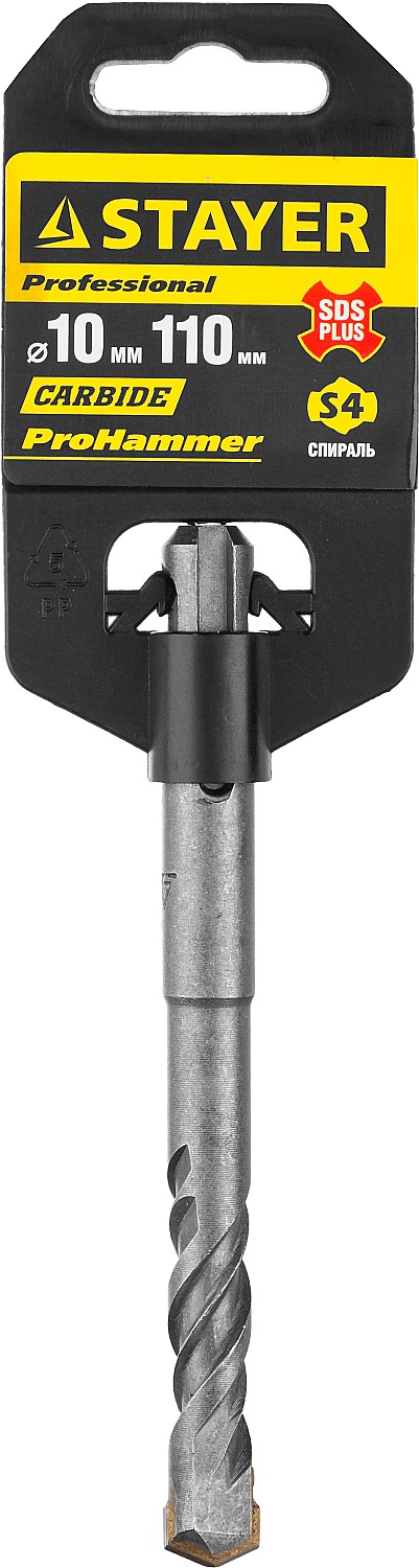 Бур по бетону SDS Plus STAYER 2930-110-10_z01, для перфоратора, применяется при сверлении отверстий в бетоне, граните, кирпичной кладке, камне и твердом известняке. Повышенный ресурс. Твердосплавная пластина ВК8 в форме зубила и углом при вершине 130 облегчает центрирование бура. Спираль S4 с усиленным сердечником обеспечивает оптимальное соотношение между устойчивостью к излому бура и быстрым отводом шлама.