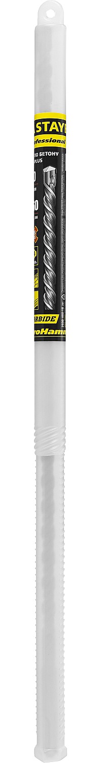 Бур по бетону SDS Plus STAYER 2930-460-10_z01, для перфоратора, применяется при сверлении отверстий в бетоне, граните, кирпичной кладке, камне и твердом известняке. Повышенный ресурс. Твердосплавная пластина ВК8 в форме зубила и углом при вершине 130 облегчает центрирование бура. Спираль S4 с усиленным сердечником обеспечивает оптимальное соотношение между устойчивостью к излому бура и быстрым отводом шлама.
