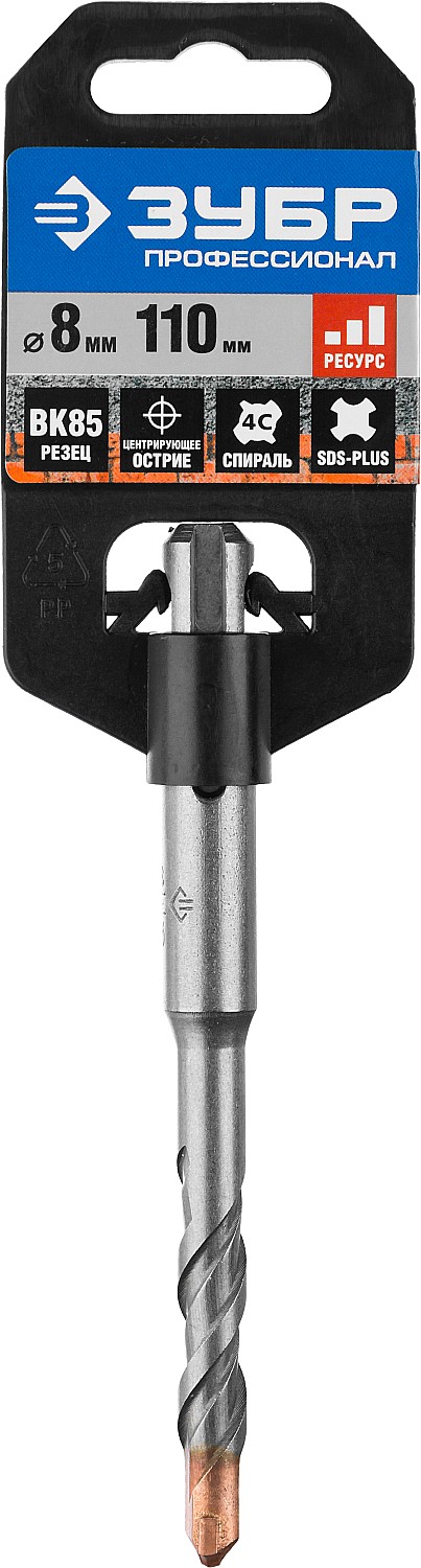 Бур по бетону SDS Plus ЗУБР 29314-110-08_z01, для ударного сверления отверстий в бетоне, граните, кирпичной кладке, камне и твердых известняках. Используются на легких и средних перфораторах с зажимом SDS-plus. Имеет повышенный ресурс благодаря усиленному наконечнику из твердого сплава ВК85. Конструкция головки бура из наконечника с двумя резцами и центрирующим острием для быстрого сверления. Геометрия наконечника в форме зубила для динамичного и агрессивного врезания в материал. Спираль 4С с усиленным сердечником обеспечивает оптимальное соотношение между устойчивостью к излому бура и быстрым отводом шлама, подавляет вибрацию и способствует лучшей передаче энергии удара непосредственно на твердосплавный резец. Износостойкое покрытие защищает от коррозии.