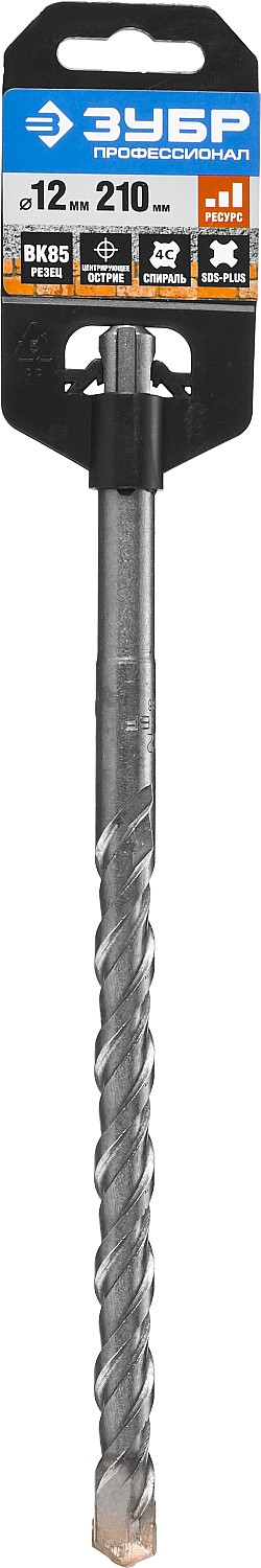 Бур по бетону SDS Plus ЗУБР 29314-210-12_z01, для ударного сверления отверстий в бетоне, граните, кирпичной кладке, камне и твердых известняках. Используются на легких и средних перфораторах с зажимом SDS-plus. Имеет повышенный ресурс благодаря усиленному наконечнику из твердого сплава ВК85. Конструкция головки бура из наконечника с двумя резцами и центрирующим острием для быстрого сверления. Геометрия наконечника в форме зубила для динамичного и агрессивного врезания в материал. Спираль 4С с усиленным сердечником обеспечивает оптимальное соотношение между устойчивостью к излому бура и быстрым отводом шлама, подавляет вибрацию и способствует лучшей передаче энергии удара непосредственно на твердосплавный резец. Износостойкое покрытие защищает от коррозии.