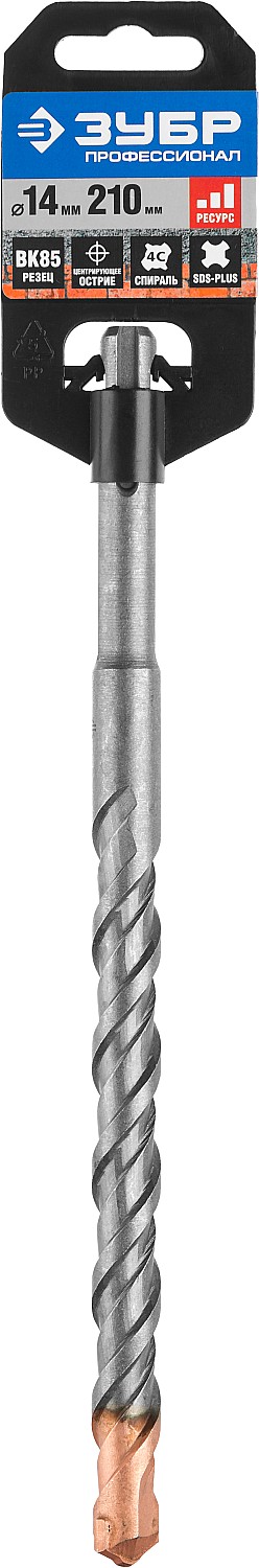 Бур по бетону SDS Plus ЗУБР 29314-210-14_z01, для ударного сверления отверстий в бетоне, граните, кирпичной кладке, камне и твердых известняках. Используются на легких и средних перфораторах с зажимом SDS-plus. Имеет повышенный ресурс благодаря усиленному наконечнику из твердого сплава ВК85. Конструкция головки бура из наконечника с двумя резцами и центрирующим острием для быстрого сверления. Геометрия наконечника в форме зубила для динамичного и агрессивного врезания в материал. Спираль 4С с усиленным сердечником обеспечивает оптимальное соотношение между устойчивостью к излому бура и быстрым отводом шлама, подавляет вибрацию и способствует лучшей передаче энергии удара непосредственно на твердосплавный резец. Износостойкое покрытие защищает от коррозии.