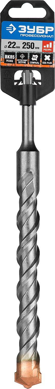 Бур по бетону SDS Plus ЗУБР 29314-250-22_z01, для ударного сверления отверстий в бетоне, граните, кирпичной кладке, камне и твердых известняках. Используются на легких и средних перфораторах с зажимом SDS-plus. Имеет повышенный ресурс благодаря усиленному наконечнику из твердого сплава ВК85. Конструкция головки бура из наконечника с двумя резцами и центрирующим острием для быстрого сверления. Геометрия наконечника в форме зубила для динамичного и агрессивного врезания в материал. Спираль 4С с усиленным сердечником обеспечивает оптимальное соотношение между устойчивостью к излому бура и быстрым отводом шлама, подавляет вибрацию и способствует лучшей передаче энергии удара непосредственно на твердосплавный резец. Износостойкое покрытие защищает от коррозии.