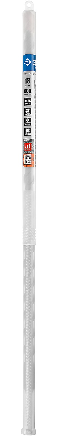 Бур по бетону SDS Plus ЗУБР 29314-600-18_z01, для перфоратора, применяется при сверлении отверстий в бетоне, граните, кирпичной кладке, камне и твердых известняках. Конструкция головки бура из твердосплавной пластины ВК85 с двумя резцами и центрирующим наконечником для быстрого сверления. Геометрия наконечника в форме зубила для динамичного и агрессивного врезания в материал. Спираль 4S с усиленным сердечником обеспечивает оптимальное соотношение между устойчивостью к излому бура и быстрым отводом шлама, подавляет вибрацию и способствует лучшей передаче энергии удара непосредственно на твердосплавный резец.
